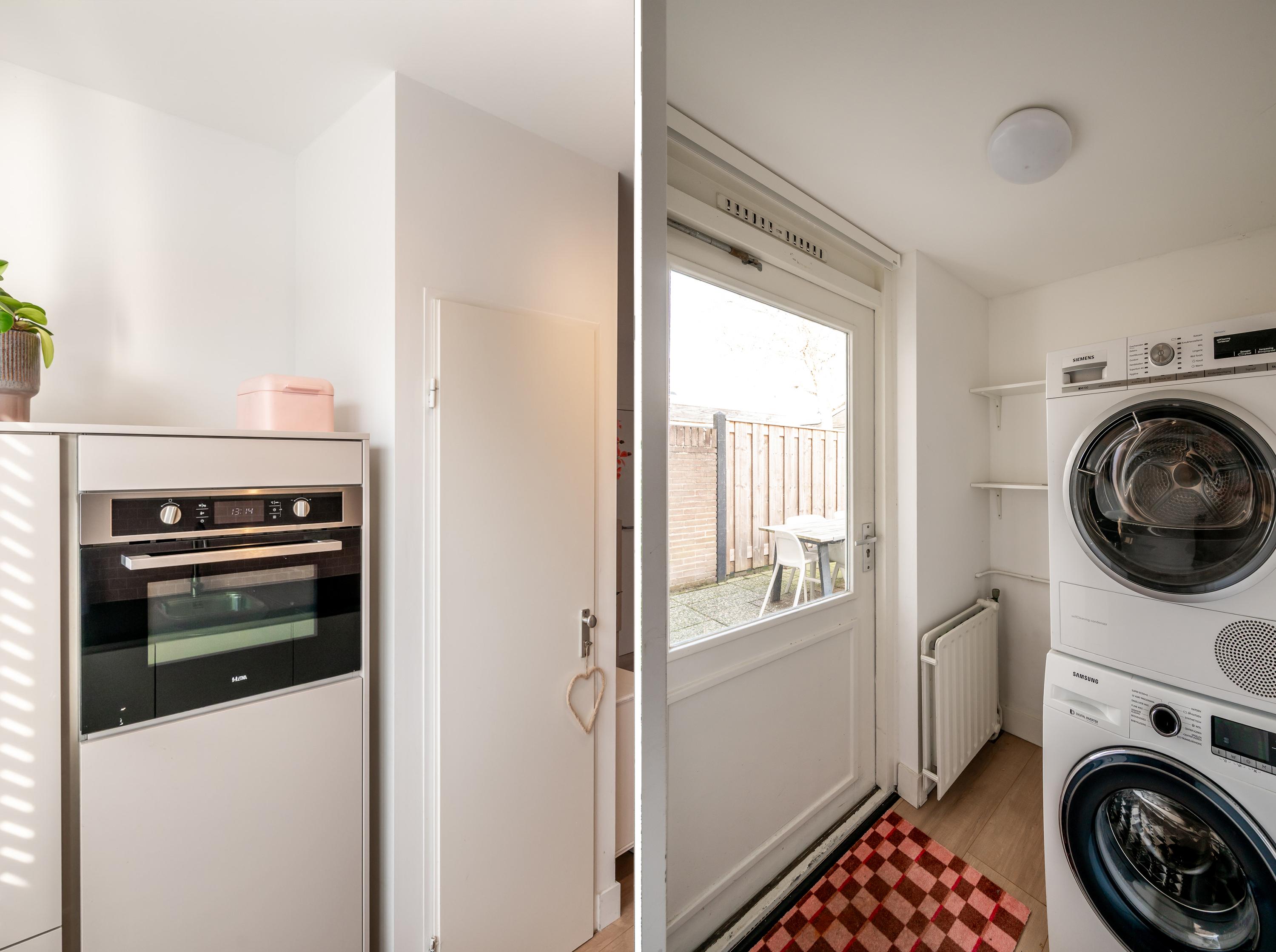 Aan de achterzijde van de woning bevindt zich de BIJKEUKEN, een zeer praktische ruimte met witgoedaansluitingen en extra bergruimte. Vanuit hier heeft u directe toegang tot de tuin
