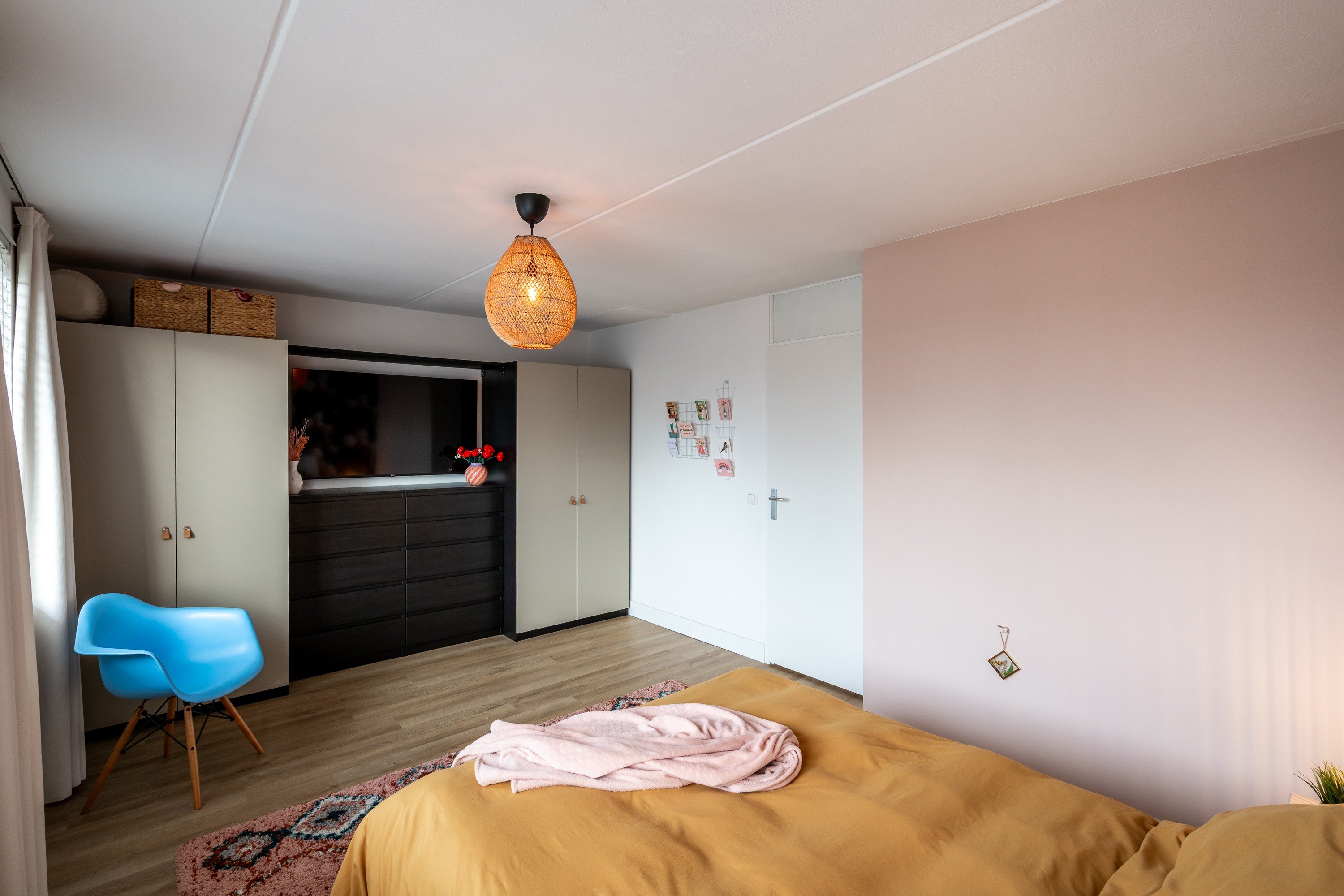 Op de eerste verdieping ligt aan de voorzijde de ruime MASTER bedroom, gesitueerd over de volledige breedte van de woning. Deze kamer biedt ruim plaats aan een tweepersoonsbed en is voorzien van vaste kasten, met daartussen een centrale plek voor de televisie.