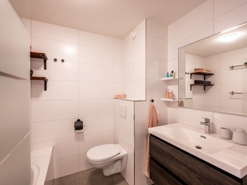 De ruimte is compleet uitgevoerd met een bad/douchecombinatie, toilet en wastafelmeubel.