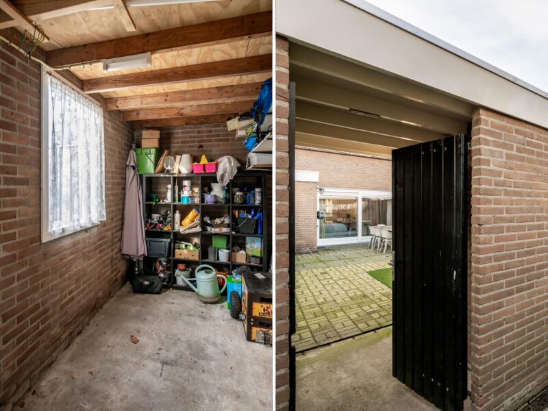Achterin de tuin bevindt zich de stenen BERGING, ideaal voor het stallen van fietsen, gereedschap en seizoensspullen. Aansluitend is een OVERKAPPING aanwezig, waardoor u droog en beschut via de ACHTEROM de tuin kunt bereiken.