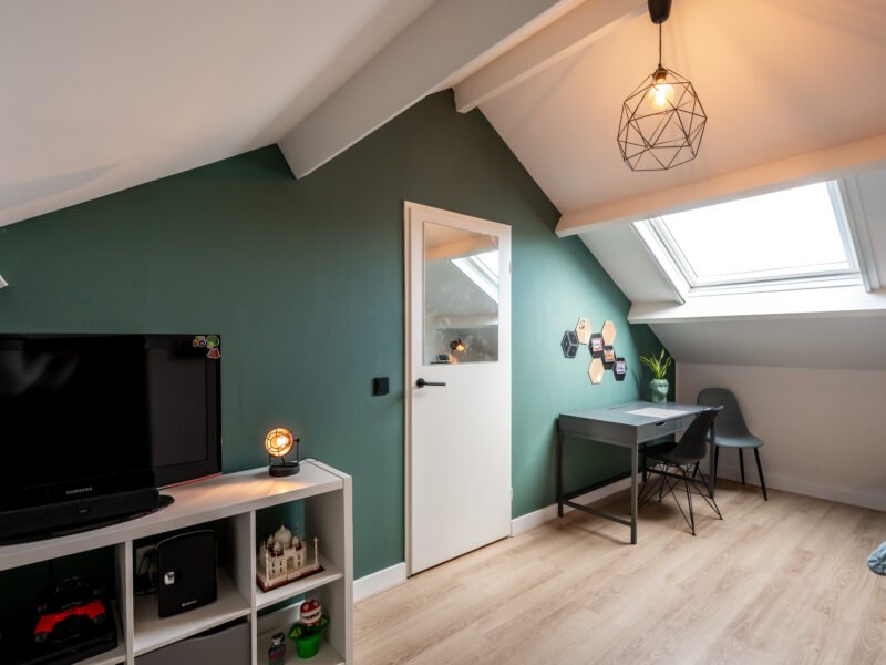 Via een vaste trap bereiken we de TWEEDE verdieping. Op de voorzolder is een werkplek gerealiseerd en vindt u een aparte BERGING met de opstelling van de CV-ketel. Aansluitend ligt de VIERDE slaapkamer, een verrassend ruime kamer die zich uitstrekt van voor tot achter en is voorzien van een DAKRAAM. Een veelzijdige ruimte met plaats voor een bed, bureau, zithoek en kastruimte.