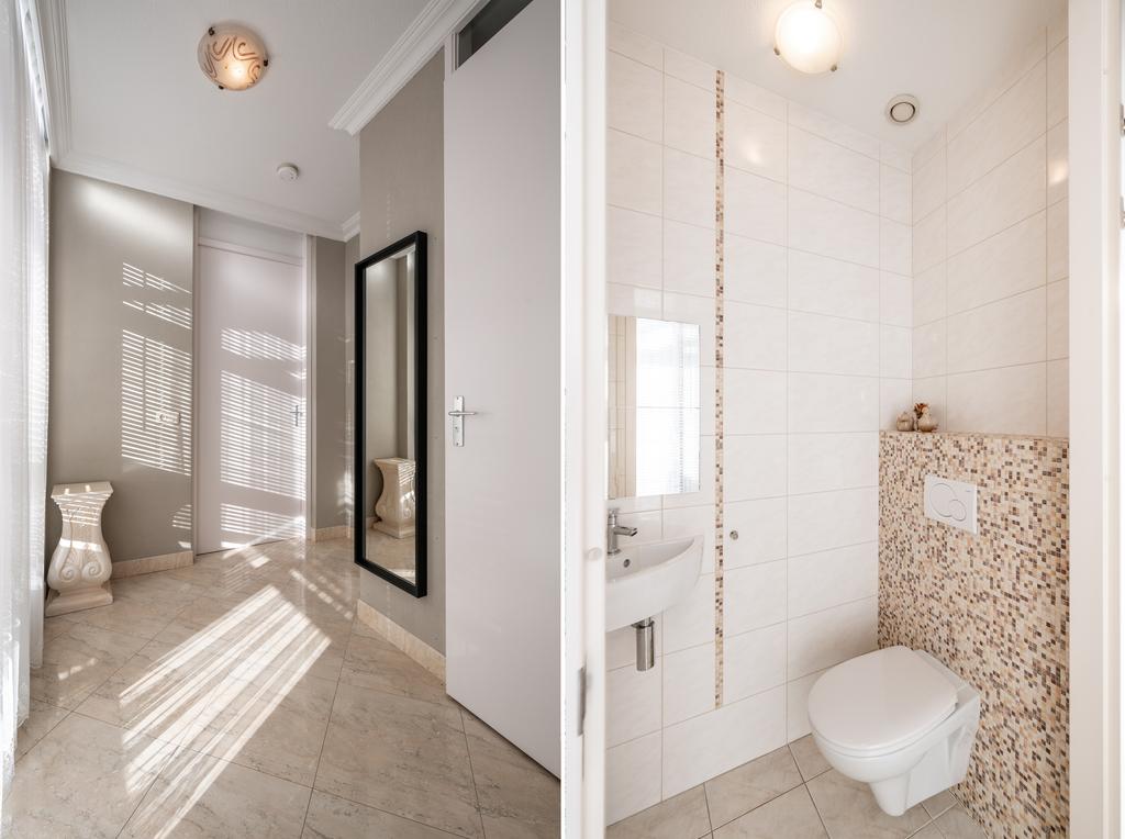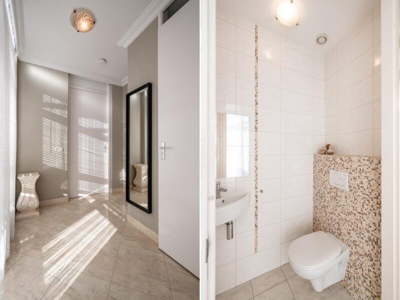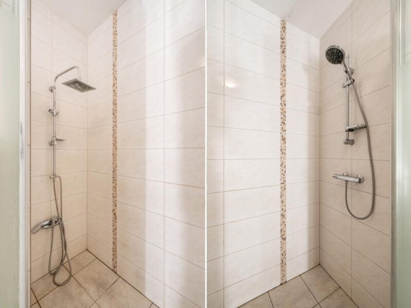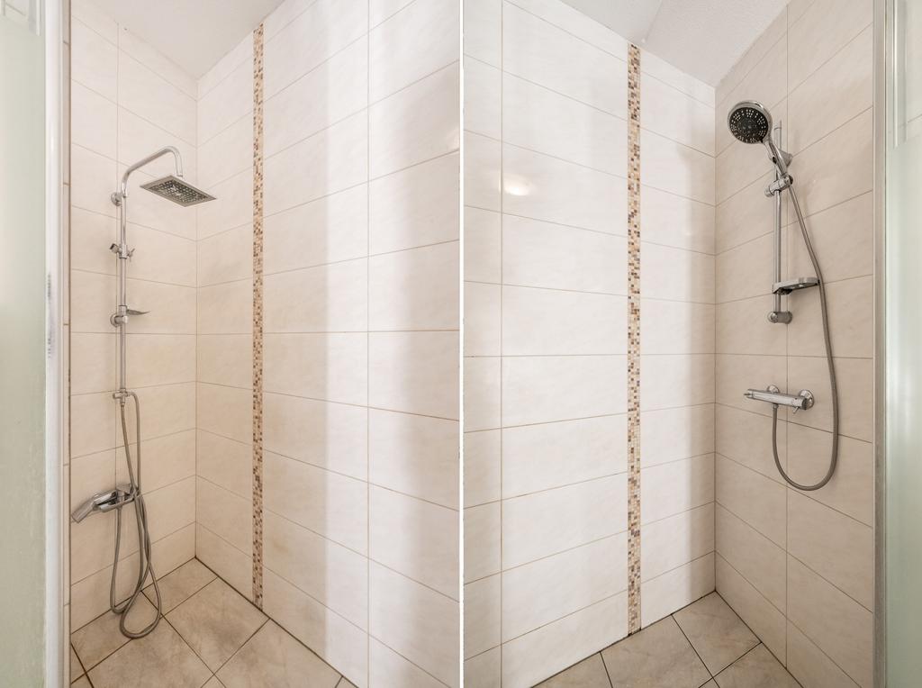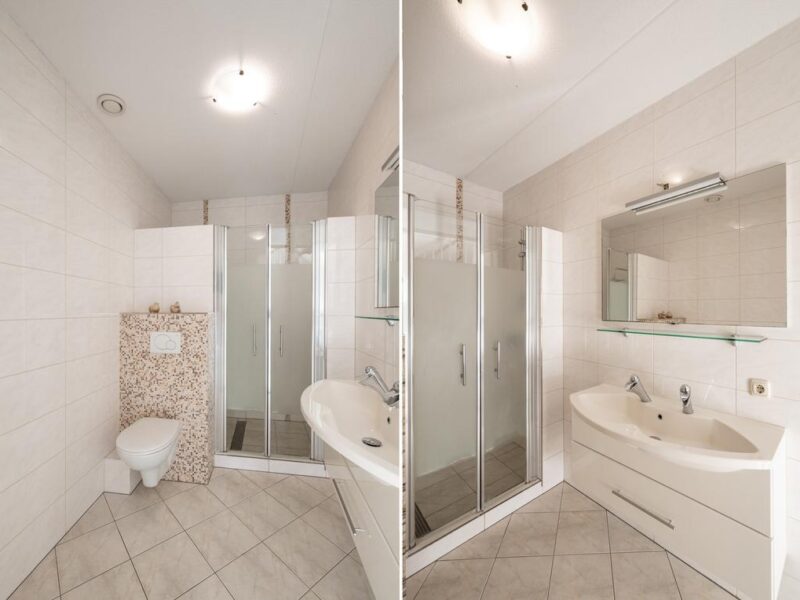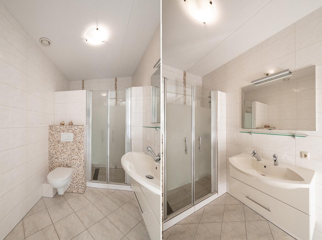 De ruimte is geheel betegeld in een lichte kleurstelling en voorzien van o.a. een DUBBELE douche, toilet, wastafelmeubel en mechanische ventilatie.