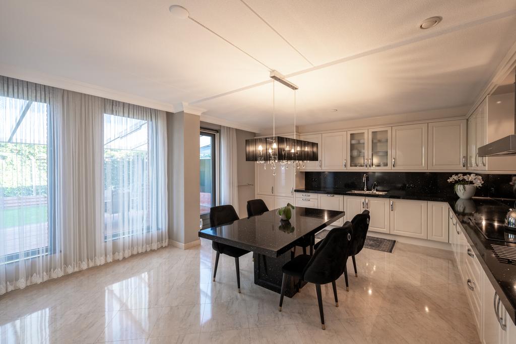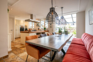 Vanuit de bouw is de keuken vergroot, door een gedeelte van de voormalige garage er bij te betrekken. Hierdoor is een geweldige keuken ontstaan waar u heerlijk met uw gasten tot in de late uurtjes kunt tafelen.