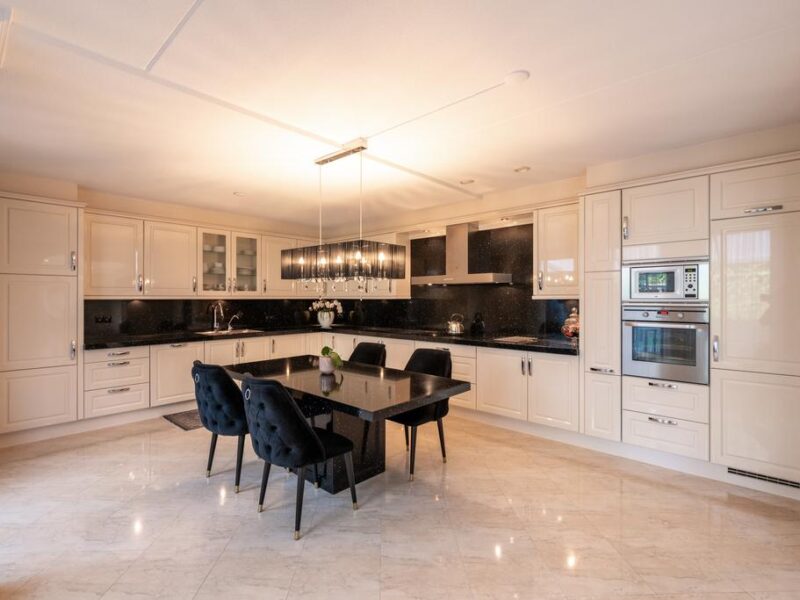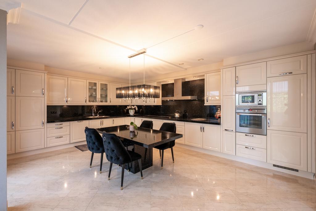De L-vormige keuken is uitgevoerd in hoogglans wit en afgewerkt met een donker aanrechtblad van GRANIET. U treft hier diverse lades en kastjes voor opbergen en voldoende workspace voor het bereiden van de heerlijkste gerechten. Qua apparatuur treft u hier o.a. een 5-pits inductie kookplaat, afzuigkap, koelkast, magnetron en oven.