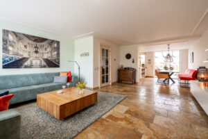 De TRAVERTIN vloer met VLOERVERWARMING Is vanuit de living doorgelegd, waardoor er sprake is van eenheid. Vanuit de keuken is de tuin (met OVERKAPPING) te betreden, daarover later meer.