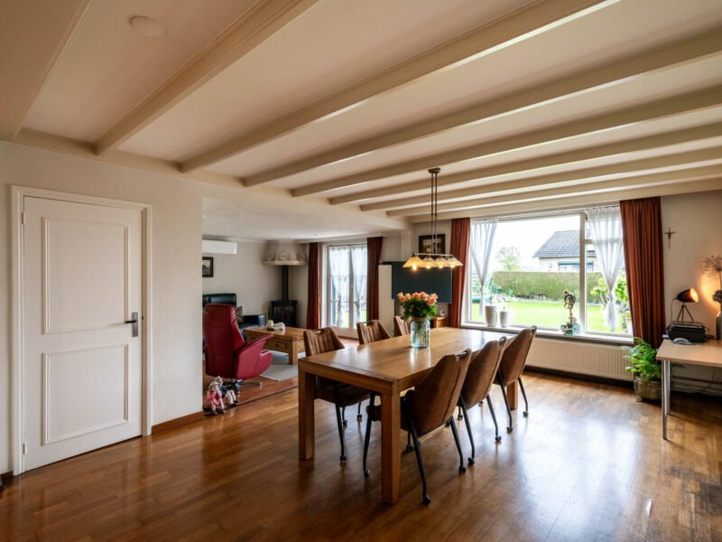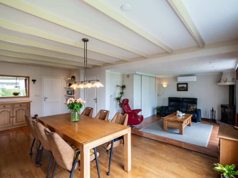 De woonkamer is keurig afgewerkt met een EIKEN houten vloer en karakteristiek BALKENplafond, wat bijdraagt aan de landelijke sfeer. De OPEN HAARD vormt een sfeervol middelpunt op koude dagen, terwijl de aanwezige AIRCO in de zomer zorgt voor verkoeling en desgewenst ook kan bij verwarmen.