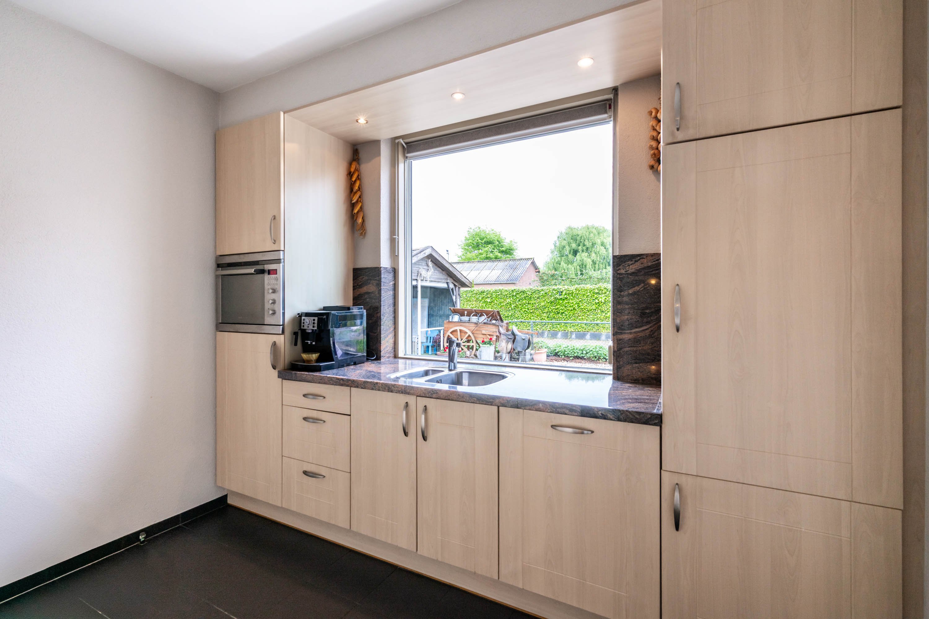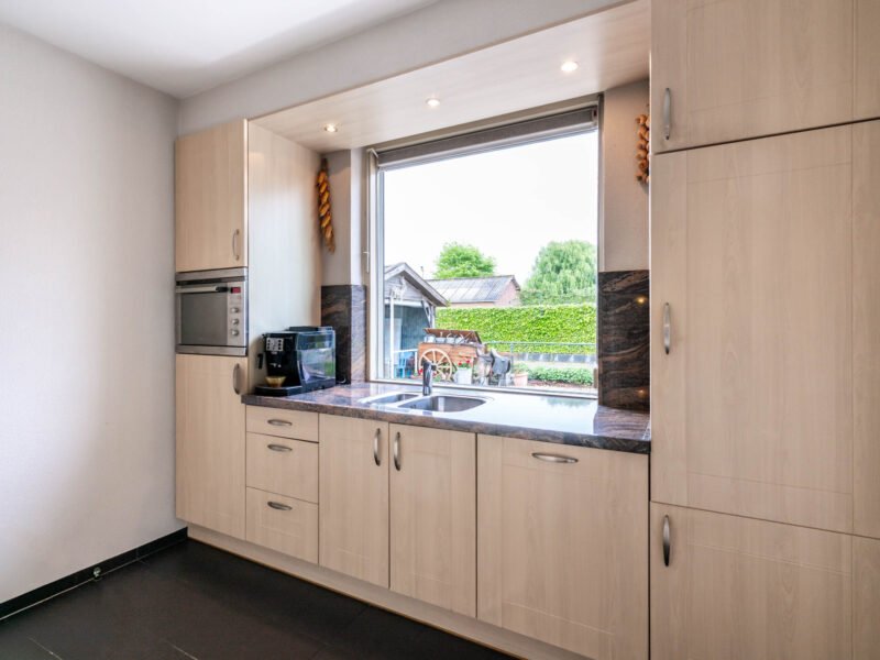 De keuken is direct vanuit de living te bereiken en biedt een fijne werkruimte met volop daglicht dankzij het grote raam met zicht op de oprit.
