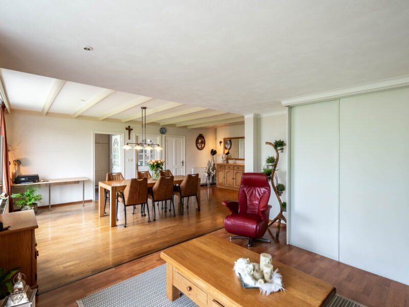 Vanuit de centrale entree met toiletruimte en trapopgang naar de verdieping heeft u toegang tot diverse vertrekken van de woning. We starten onze rondleiding in de royale living aan de achterzijde.