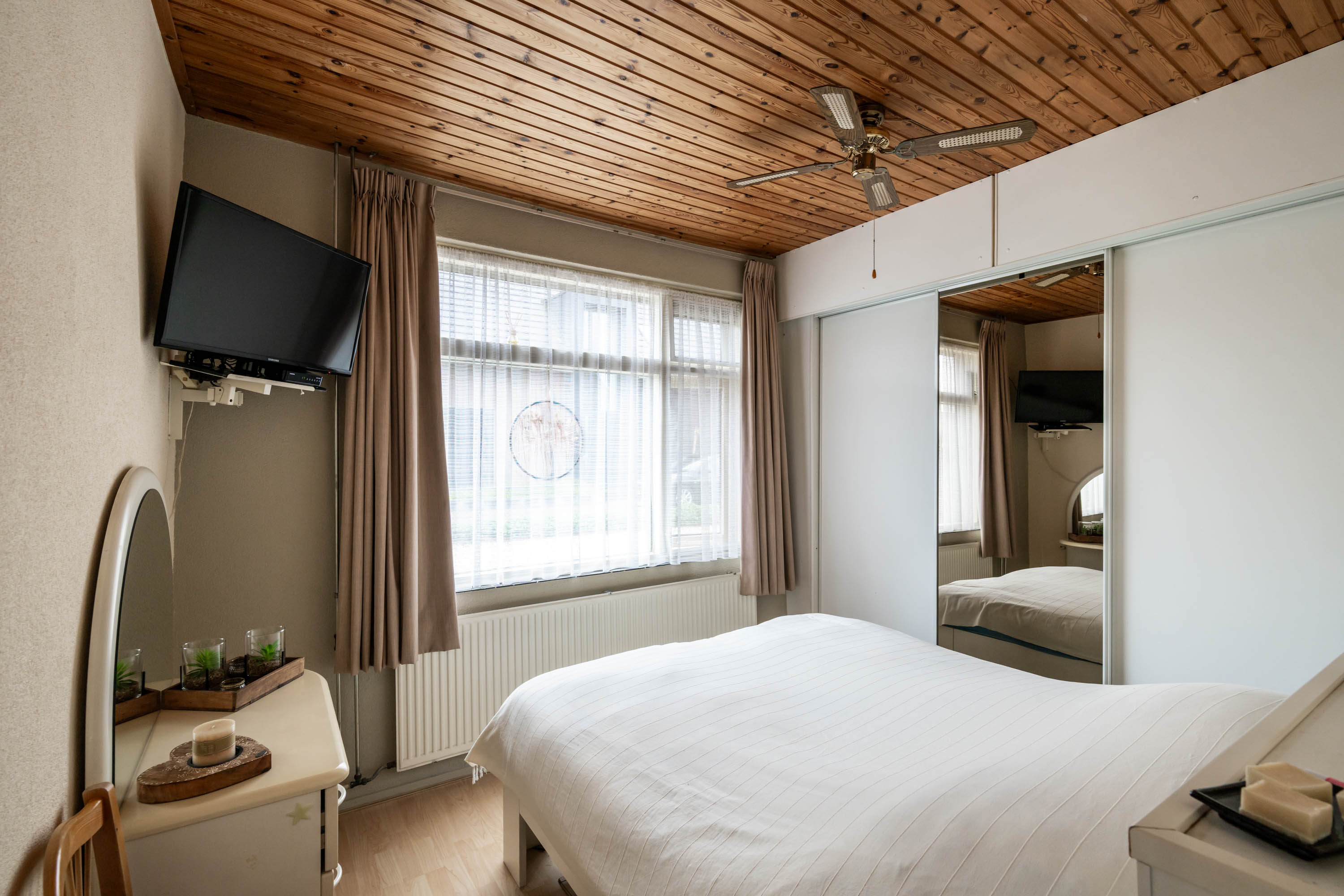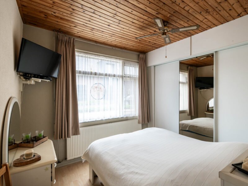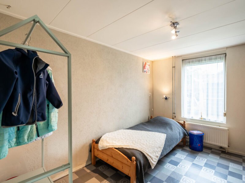 Vanaf de overloop bereikt u een slaapkamer aan de achterzijde, met prettig zicht op de achtertuin. Een rustige plek, bijvoorbeeld als logeer- of werkkamer, of eenvoudig te betrekken bij een toekomstige herindeling.