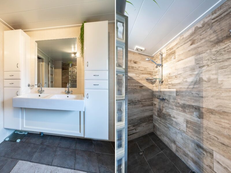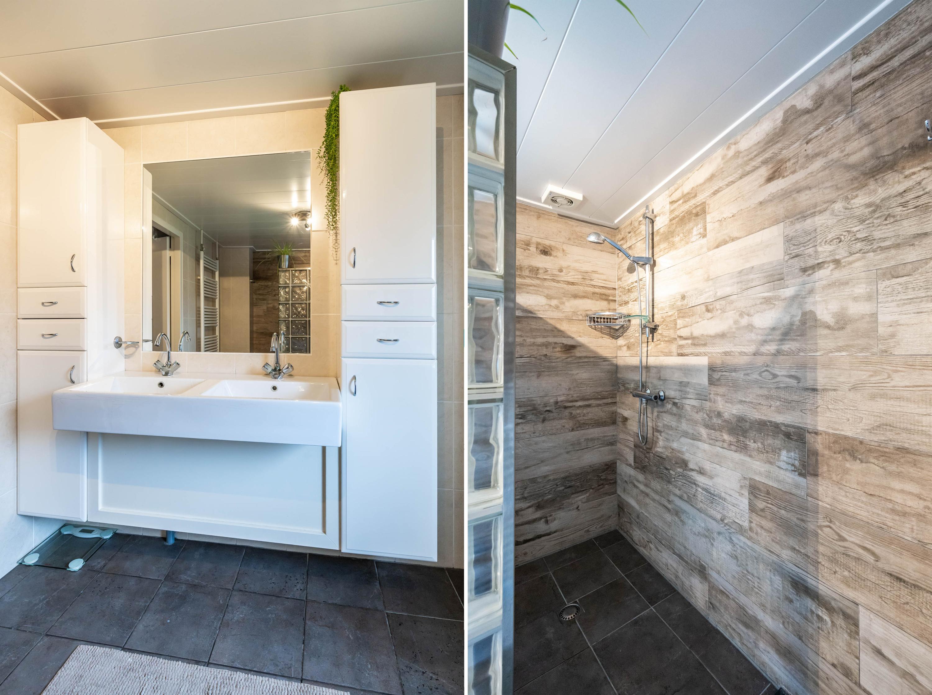 De ruimte is volledig betegeld en uitgerust met een dubbel wastafelmeubel en inloopdouche. Praktisch en comfortabel in gebruik.