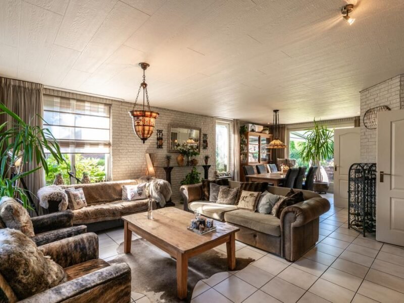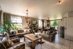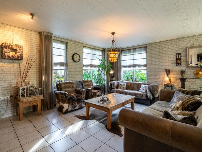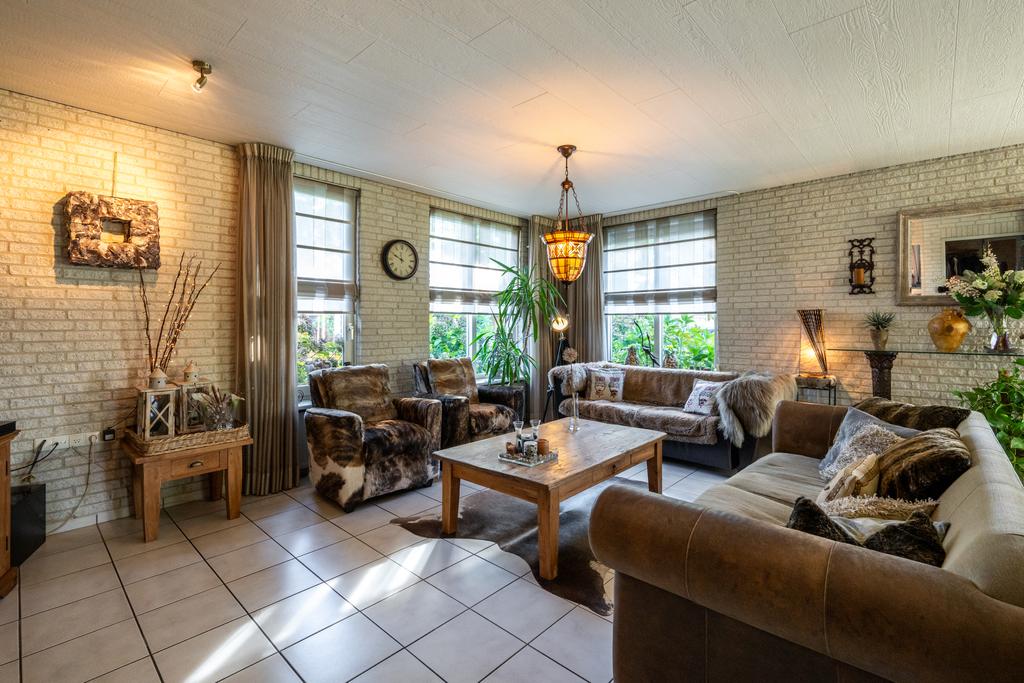 De living is een fijne ruimte met rondom raampartijen voor optimale lichtinval. Een GASKACHEL vormt het centrale middelpunt in het zitgedeelte.