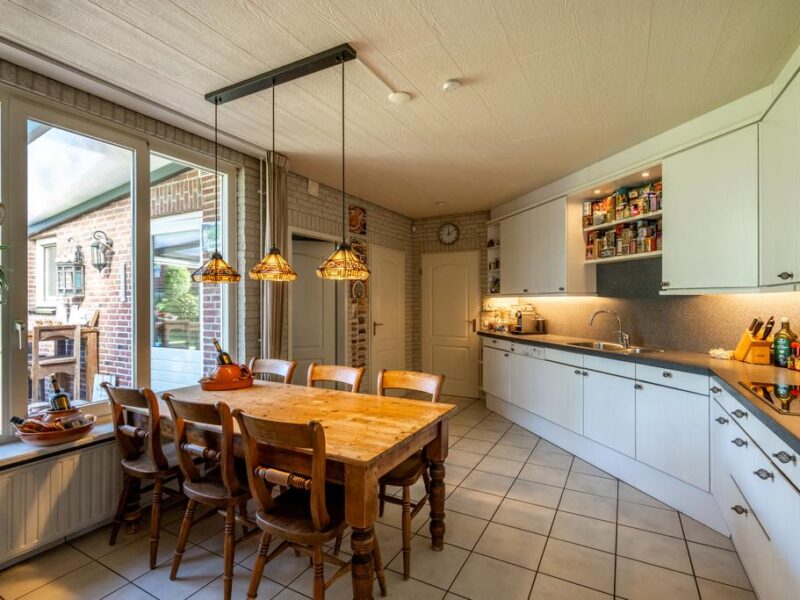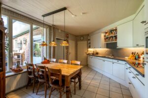 De speelse opstelling van het keukenblok zorgt voor een ruimtelijk effect en voldoende gelegenheid voor het plaatsen van een eettafel. Vanuit de keuken heeft u zicht op uw tuin.