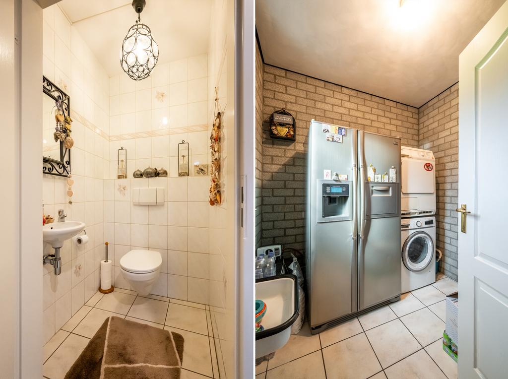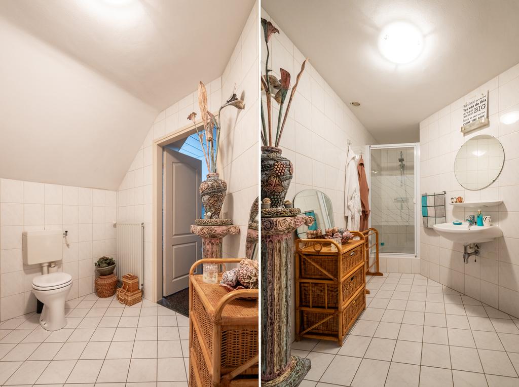 De badkamer op de eerste verdieping is geheel betegeld in een lichte kleurstelling en voorzien van o.a. een toilet, wastafelmeubel en douche.
