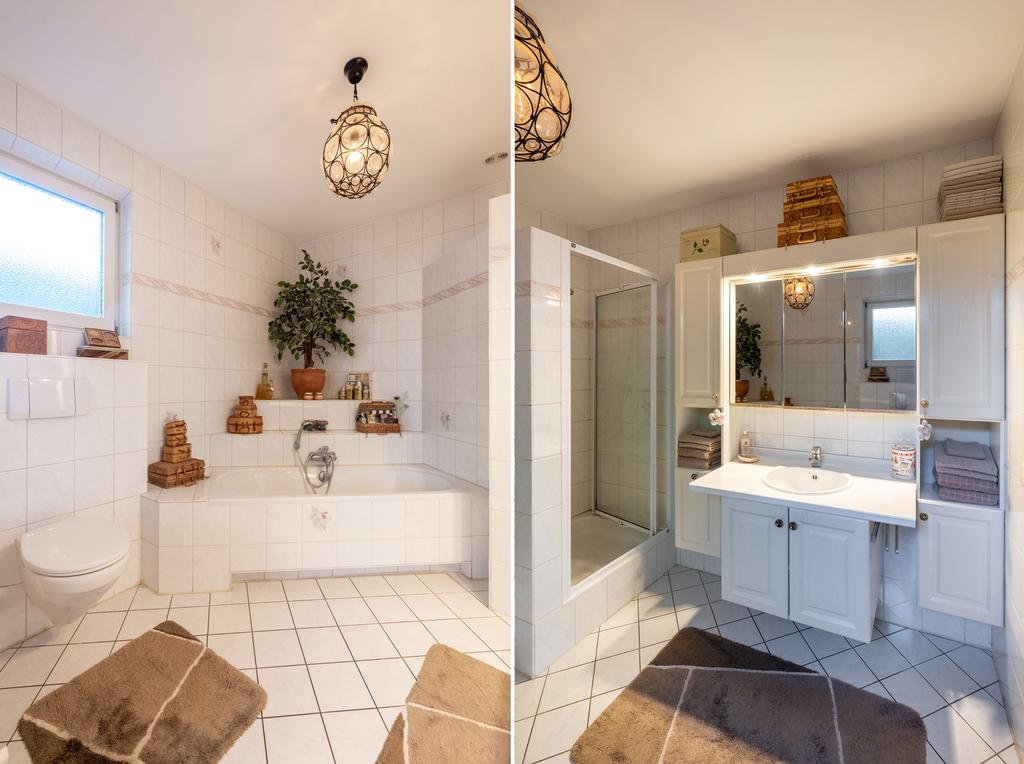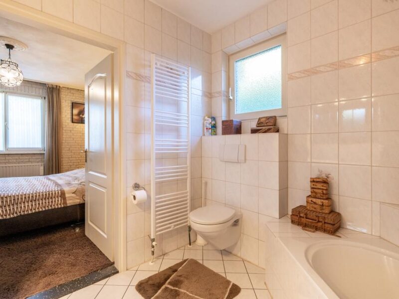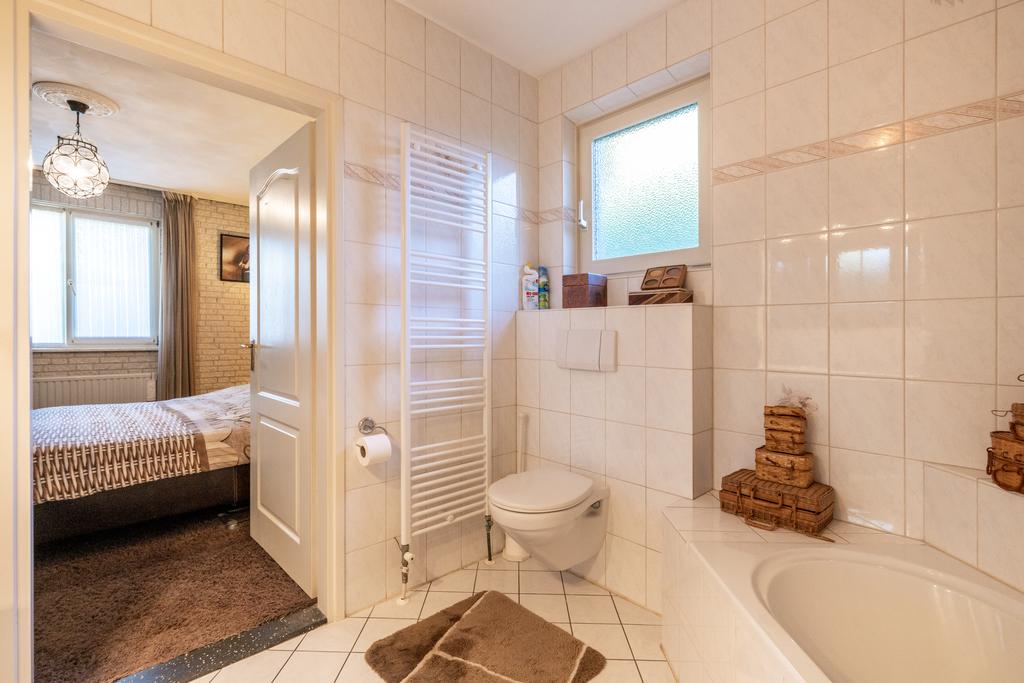 De badkamer is ENSUITE aan de slaapkamer gelegen en dus rechtstreeks vanuit de slaapkamer te betreden. De badkamer is geheel betegeld in een lichte kleurstelling en voorzien van o.a. een toilet, ligbad, douche en wastafelmeubel. Een raam zorgt voor natuurlijke lichtinval en ventilatie.