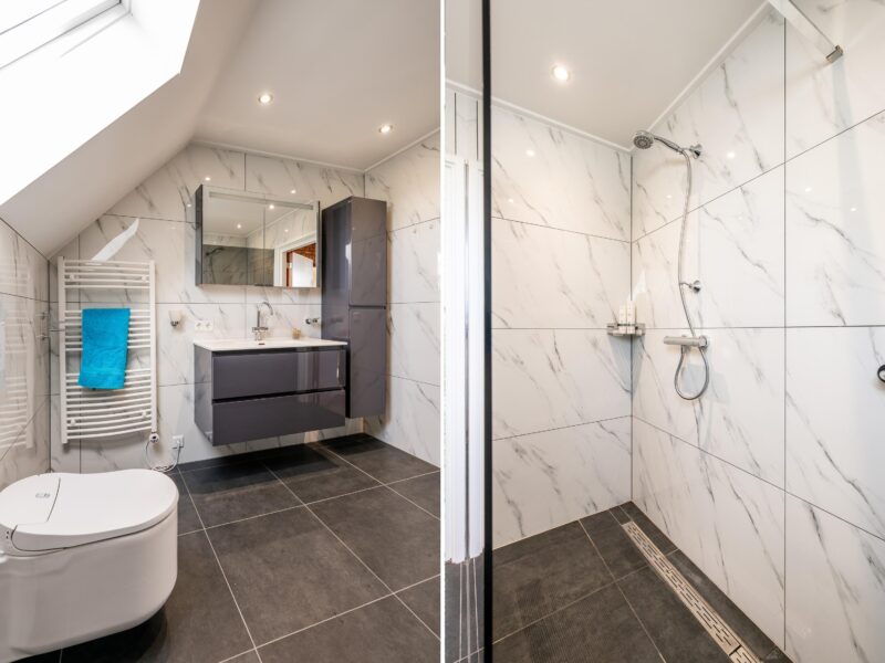 De ruimte beschikt over een royale inloopdouche, een breed wastafelmeubel en een toilet. De combinatie van VLOERVERWARMING en een designradiator zorgt voor een aangenaam comfort, het hele jaar door.