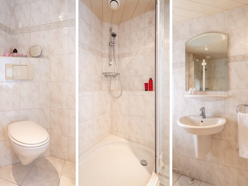 De ruimte is volledig betegeld, voorzien van een toilet, wastafel, douche en VLOERVERWARMING.