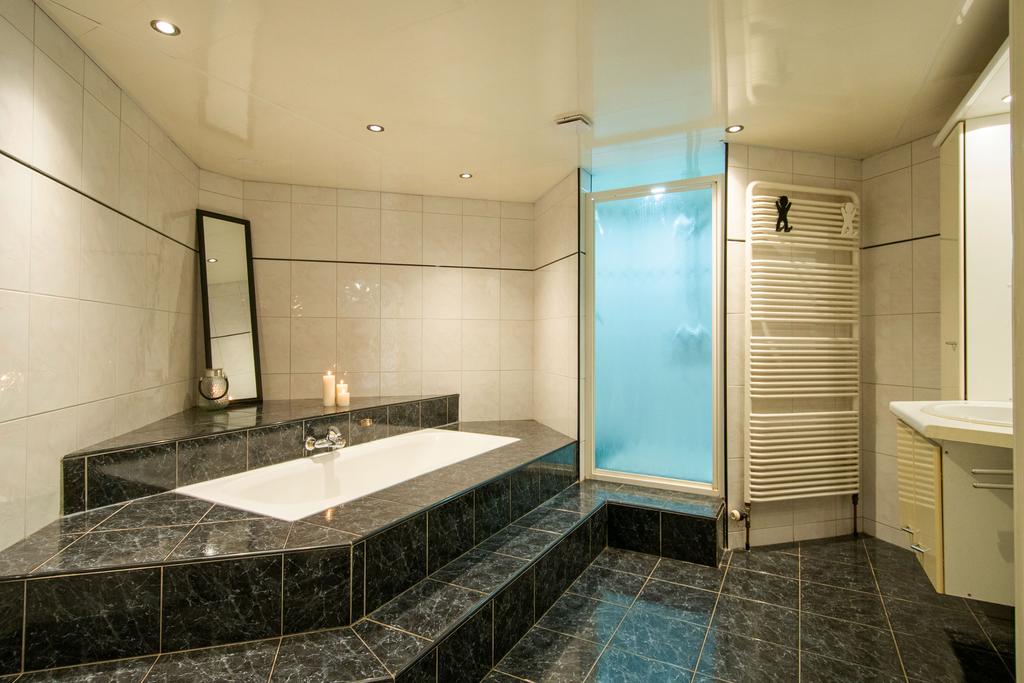 De ruimte is geheel betegeld in een zwart-wit kleurstelling. De vloer en zelfs de verhoging rondom het bad zijn voorzien van VLOERVERWARMING.