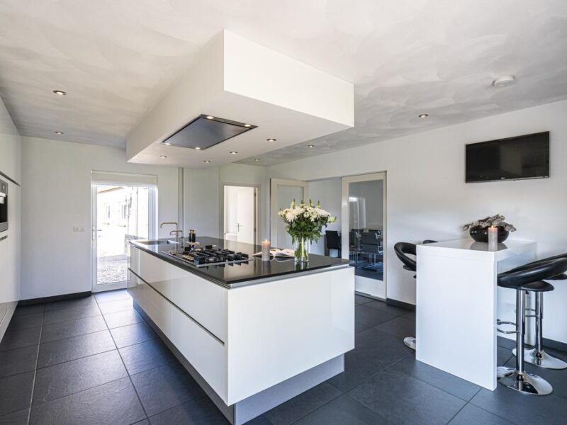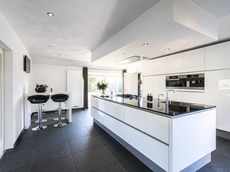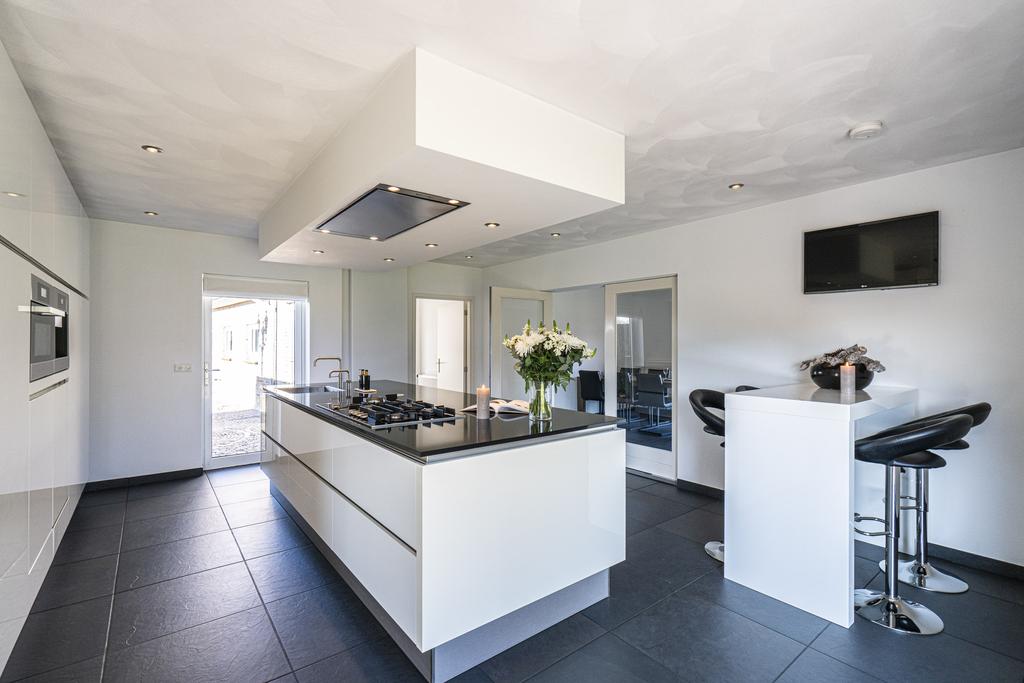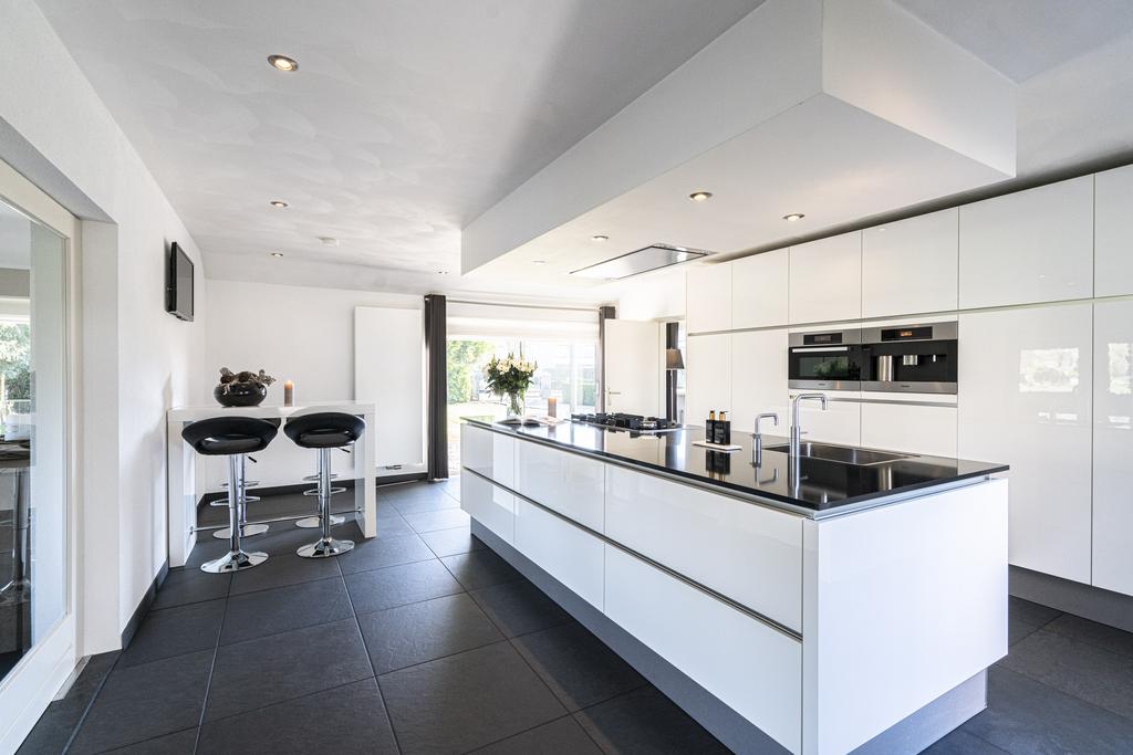 Er is o.a. beschikking over een 5-pits gasfornuis, afzuigkap, koelkast, vaatwasser (op hoogte), combi oven, quooker en koffiemachine. Stroompunten zijn praktisch weggewerkt in het aanrechtblad.