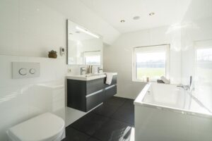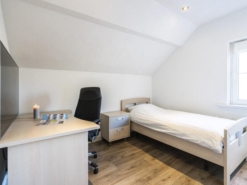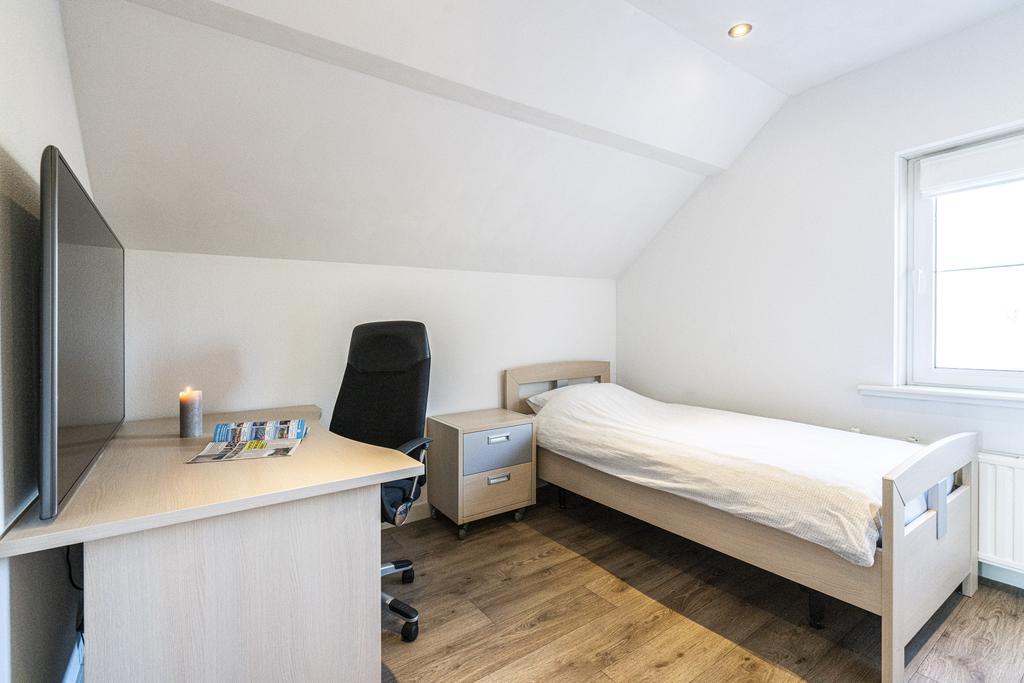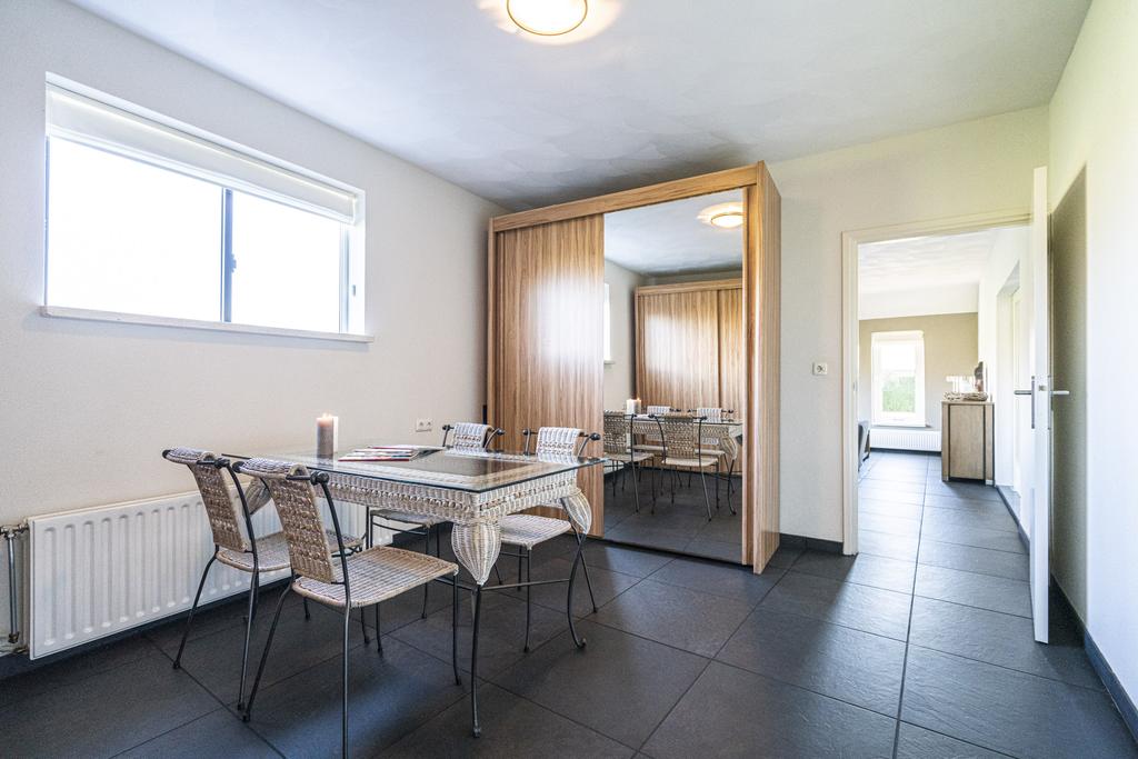 De afwerking van de living en slaapkamer zijn geheel in stijl met het woongedeelte aan de voorzijde van de woning. De vloer is in dit gedeelte voorzien van VLOERVERWARMING.