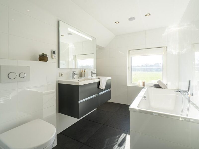 De MODERNE badkamer is gelegen aan de voorzijde van de woning. De ruimte is geheel betegeld in een geslaagde zwart-wit combinatie en voorzien van een raam voor DAGLICHTtoetreding.