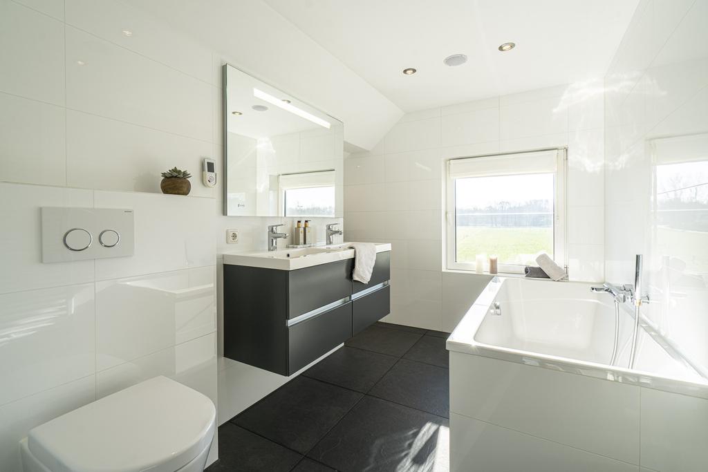 U treft hier o.a. een ligbad, toilet en dubbel wastafelmeubel. Ingebouwde audio SPEAKERS zorgen voor een sfeervolle ambiance terwijl u geniet van een rustgevend bad.