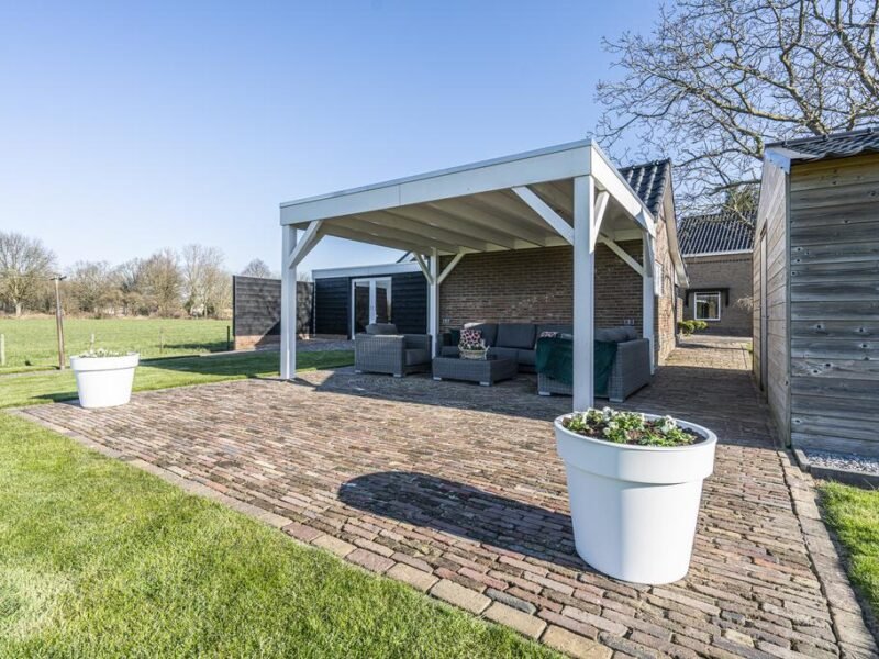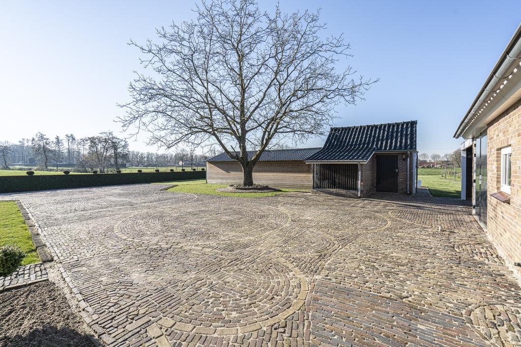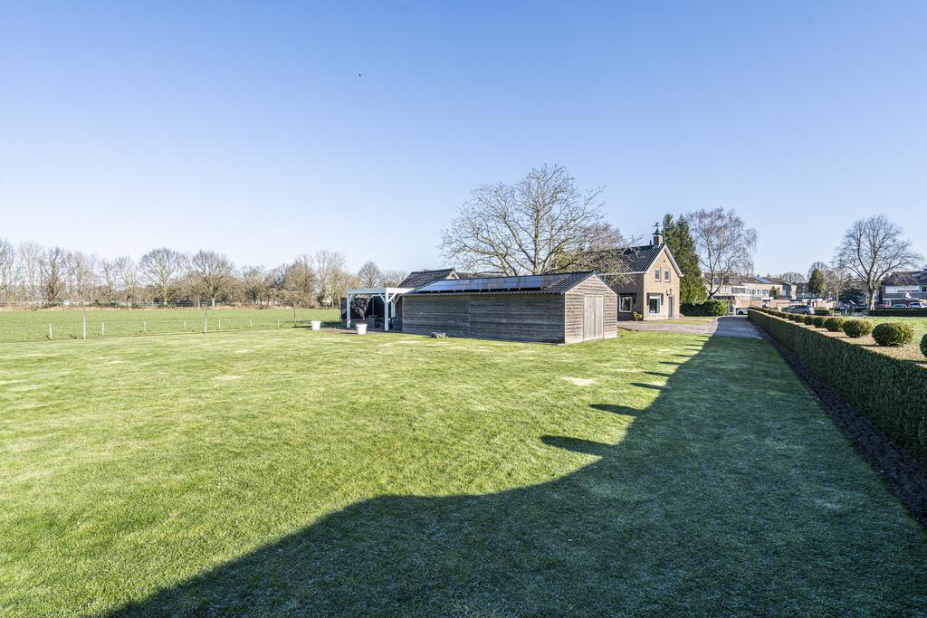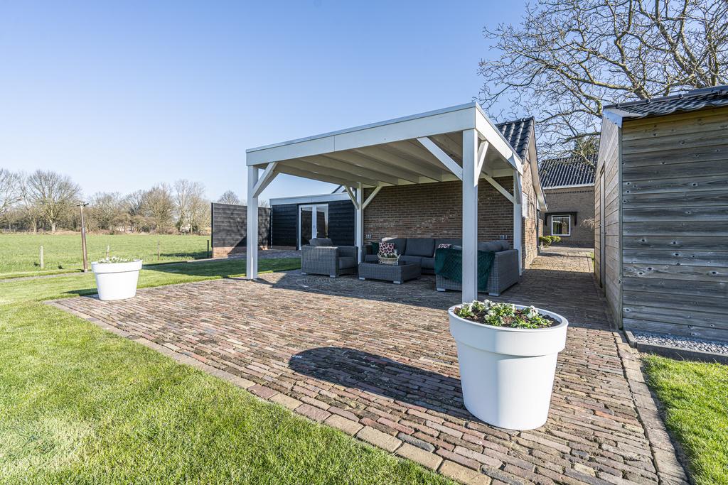 Verder is er beschikking over een stenen BERGING (voor bijvoorbeeld het stallen van uw fietsen) met een hondenhok en OVERKAPPING. Van onder de overkapping kijkt u heerlijk weg over uw tuin aan de achterzijde.