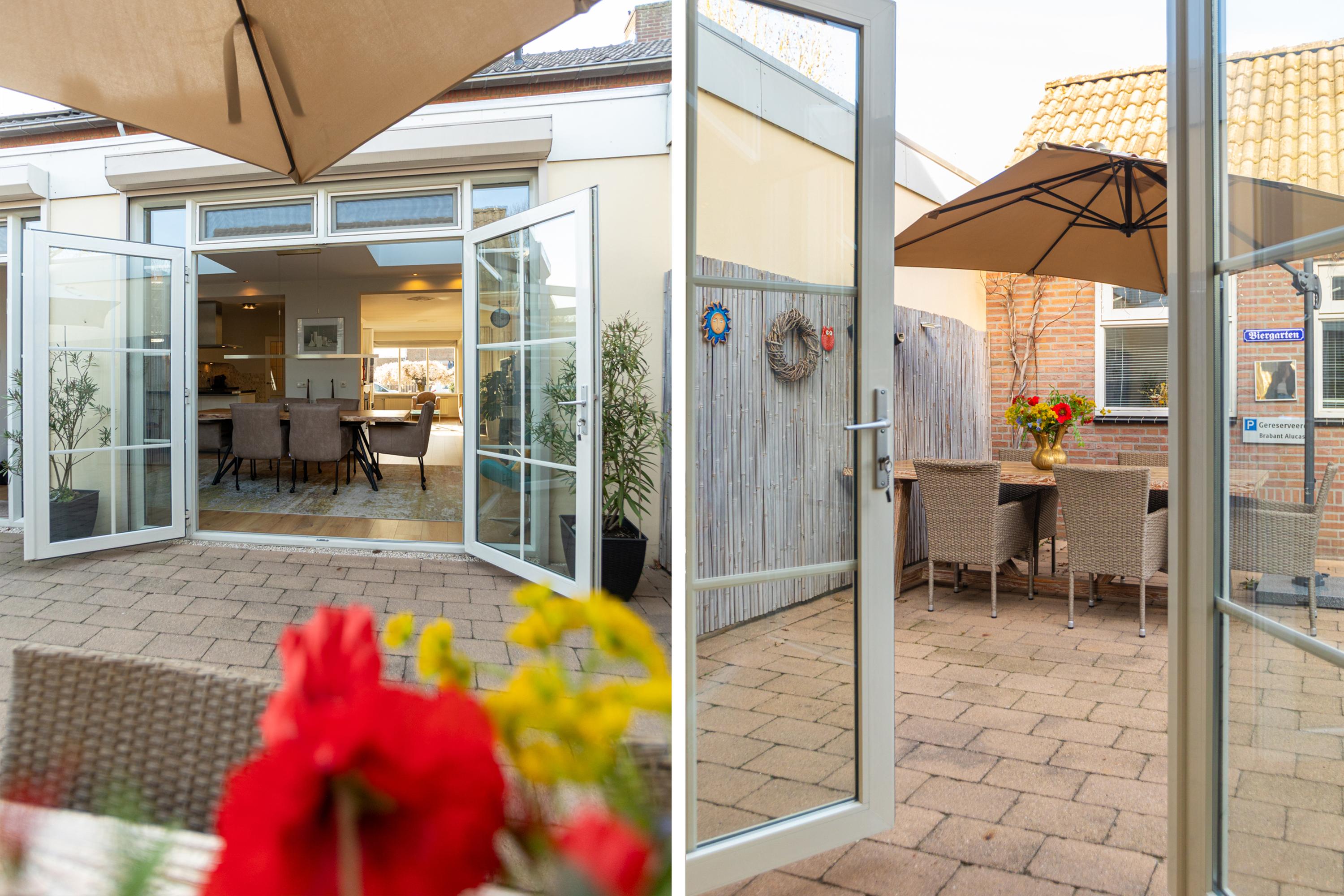 Aan de achterzijde is de woning UITGEBOUWD, waar een prachtige eetkamer is gerealiseerd. Twee grote lichtkoepels zorgen hier voor een rijke lichtinval gedurende de dag, terwijl de openslaande tuindeuren de verbinding met buiten versterken.