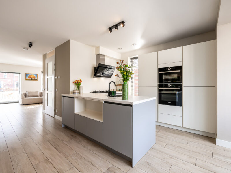 Centraal op de begane grond ligt de OPEN keuken, uitgevoerd in een neutrale en moderne stijl. Het L-vormige schiereiland is voorzien van een spoel- en kookgedeelte.