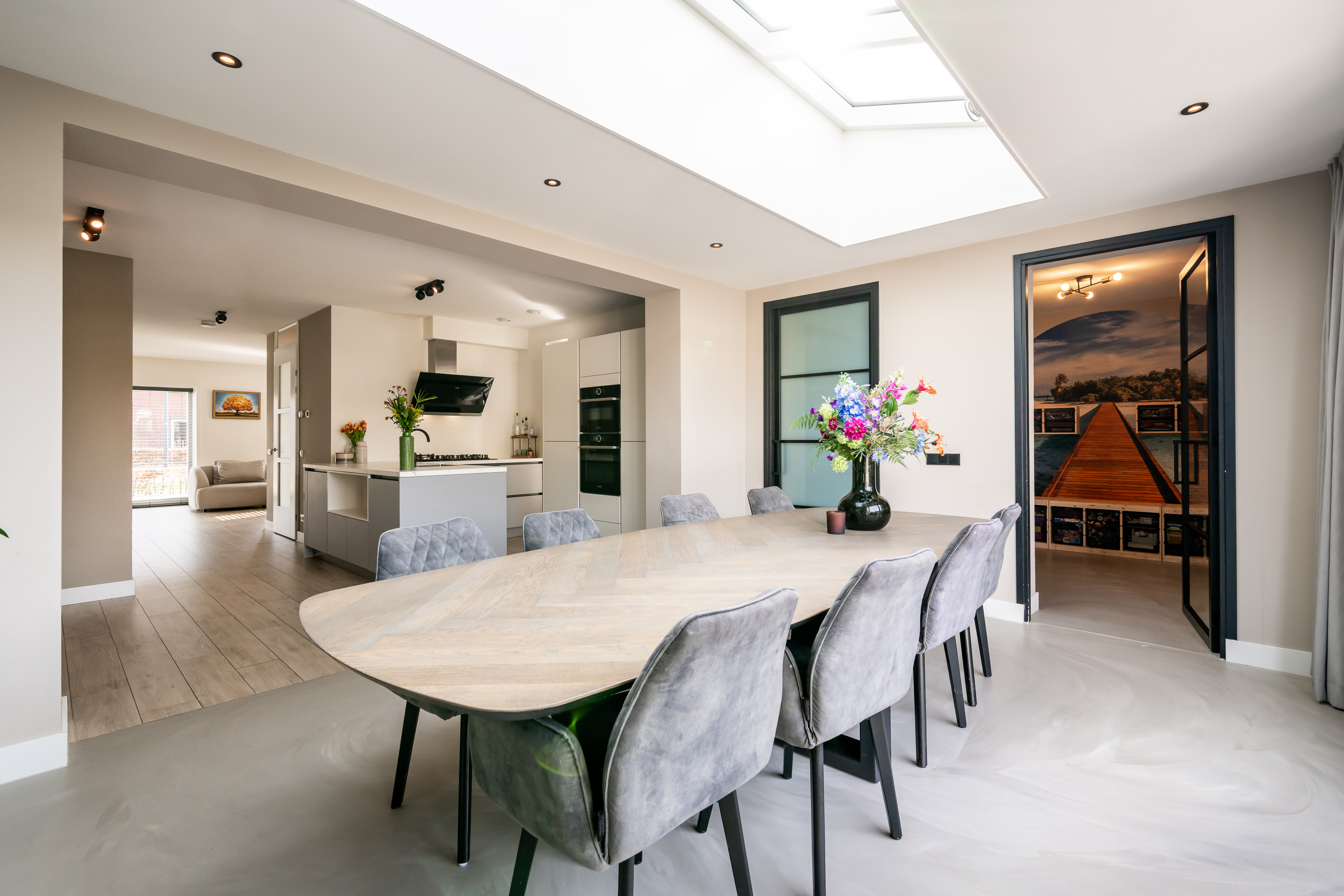 De eetkamer biedt volop plaats voor een grote eettafel waar u uitgebreid kunt tafelen met familie en vrienden. De LICHTSTRAAT zorgt voor een prachtige inval van daglicht en de openslaande tuindeuren versterken de verbinding met buiten.