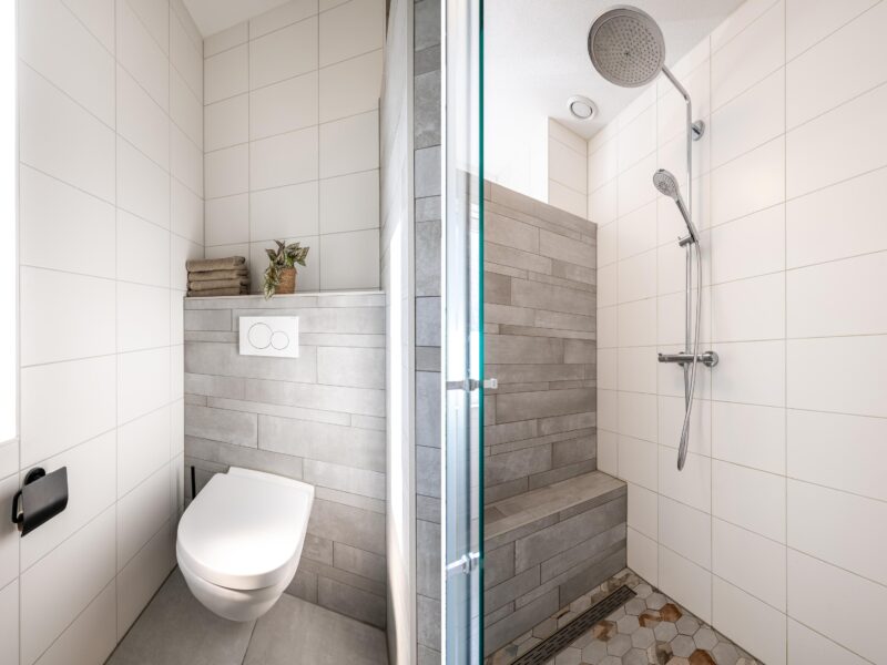 U beschikt hier over een inloopdouche, een dubbel wastafelmeubel en een toilet.