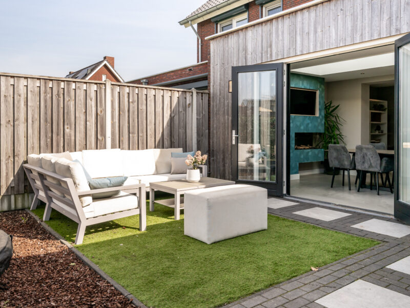 De achtertuin is gelegen op het westen en is ONDERHOUDSVRIENDELIJK aangelegd met een combinatie van bestrating en kunstgras. De praktische indeling biedt volop ruimte voor zowel een comfortabele loungeset als speelvoorzieningen.