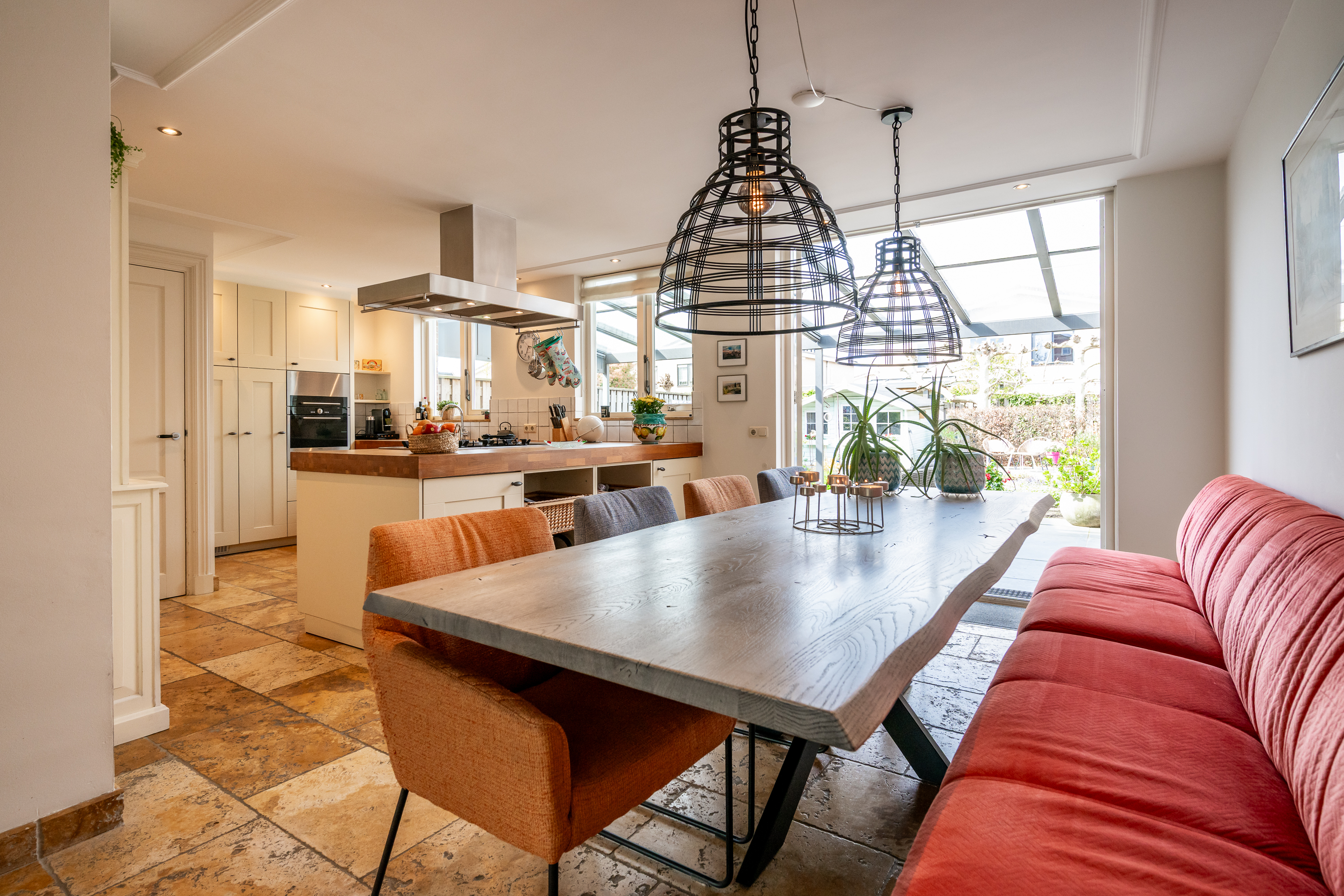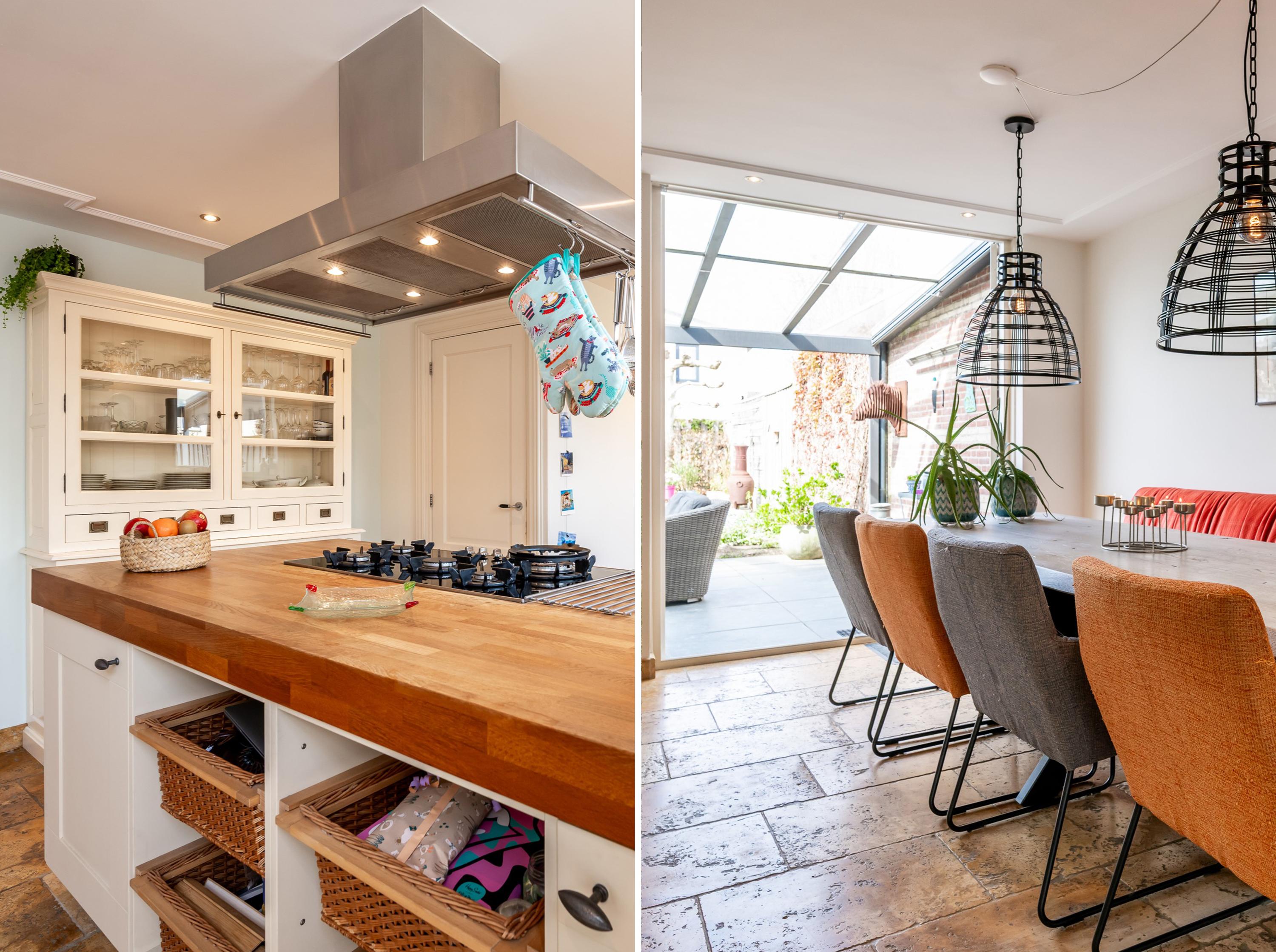 Dankzij de meerdere raampartijen en de openslaande tuindeuren staat de keuken in directe verbinding met de tuin. Dit zorgt voor veel licht en een fijne binnen-buitenbeleving.