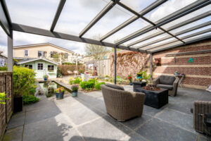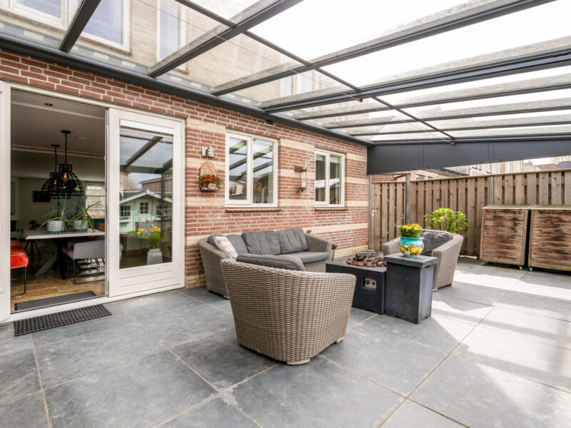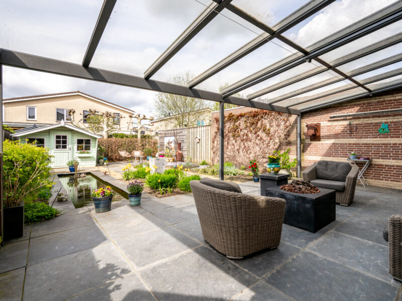 Direct aan de achtergevel vindt u een royale OVERKAPPING, waar u beschut en comfortabel kunt zitten. Hier ontstaat een fijne plek om te ontspannen, met zicht op de tuin en directe verbinding met de woning.