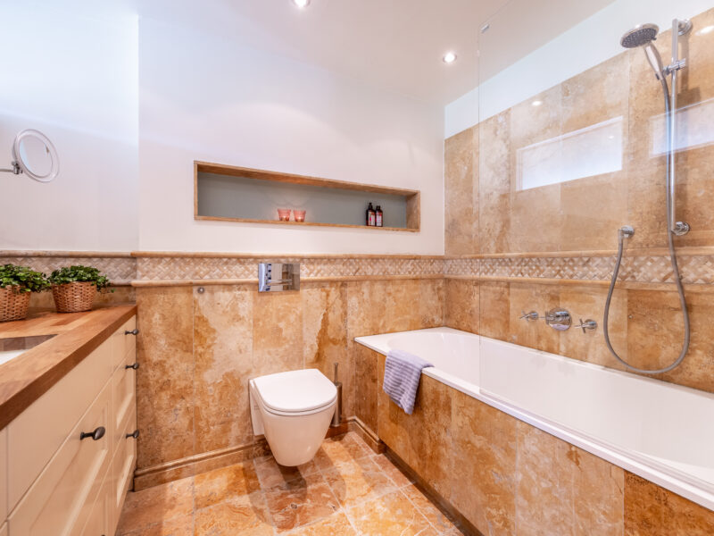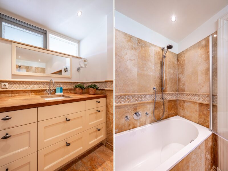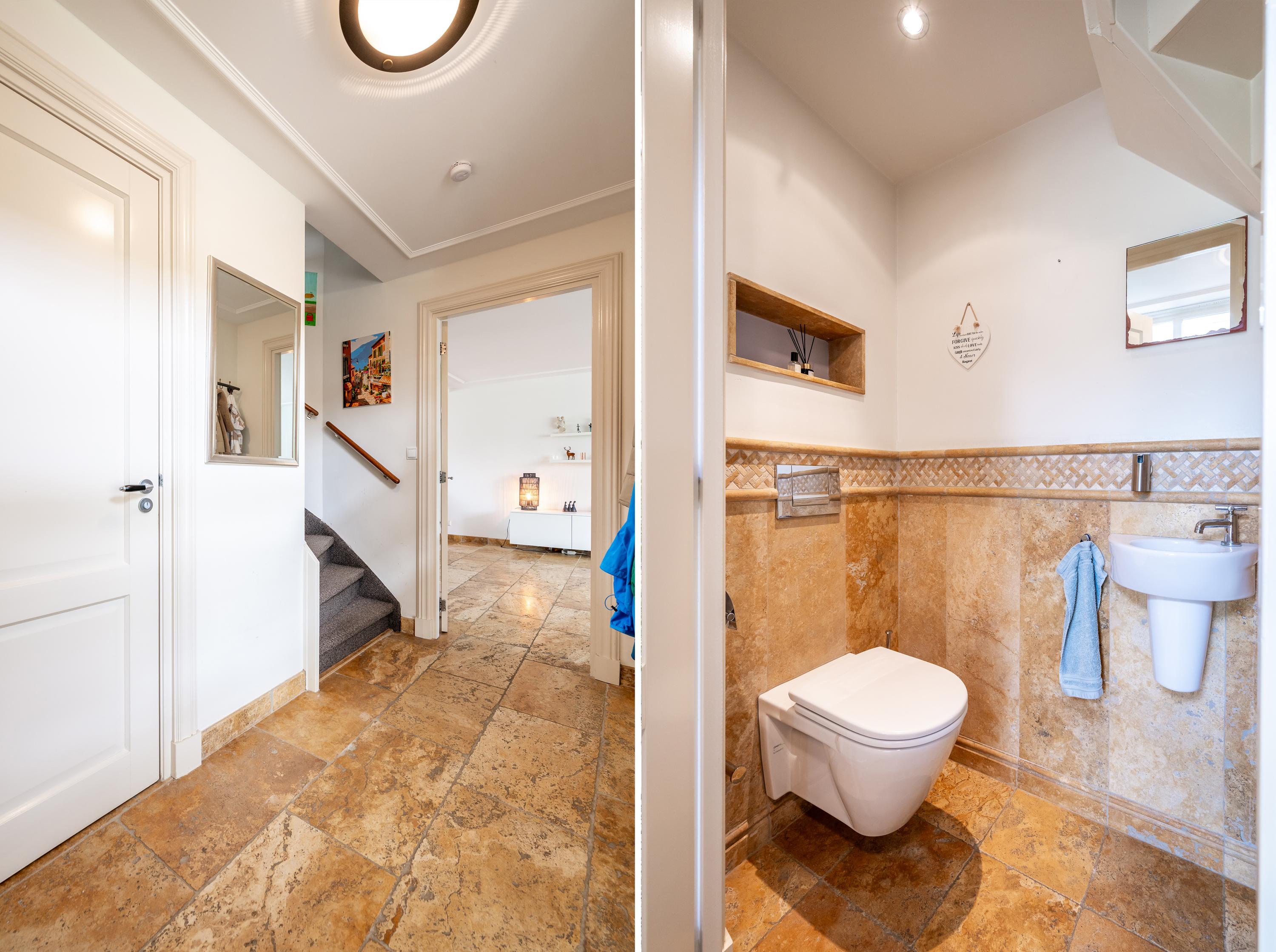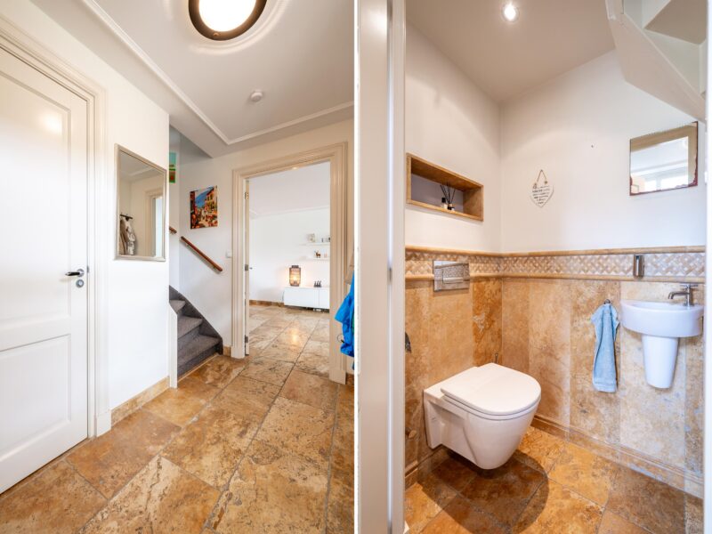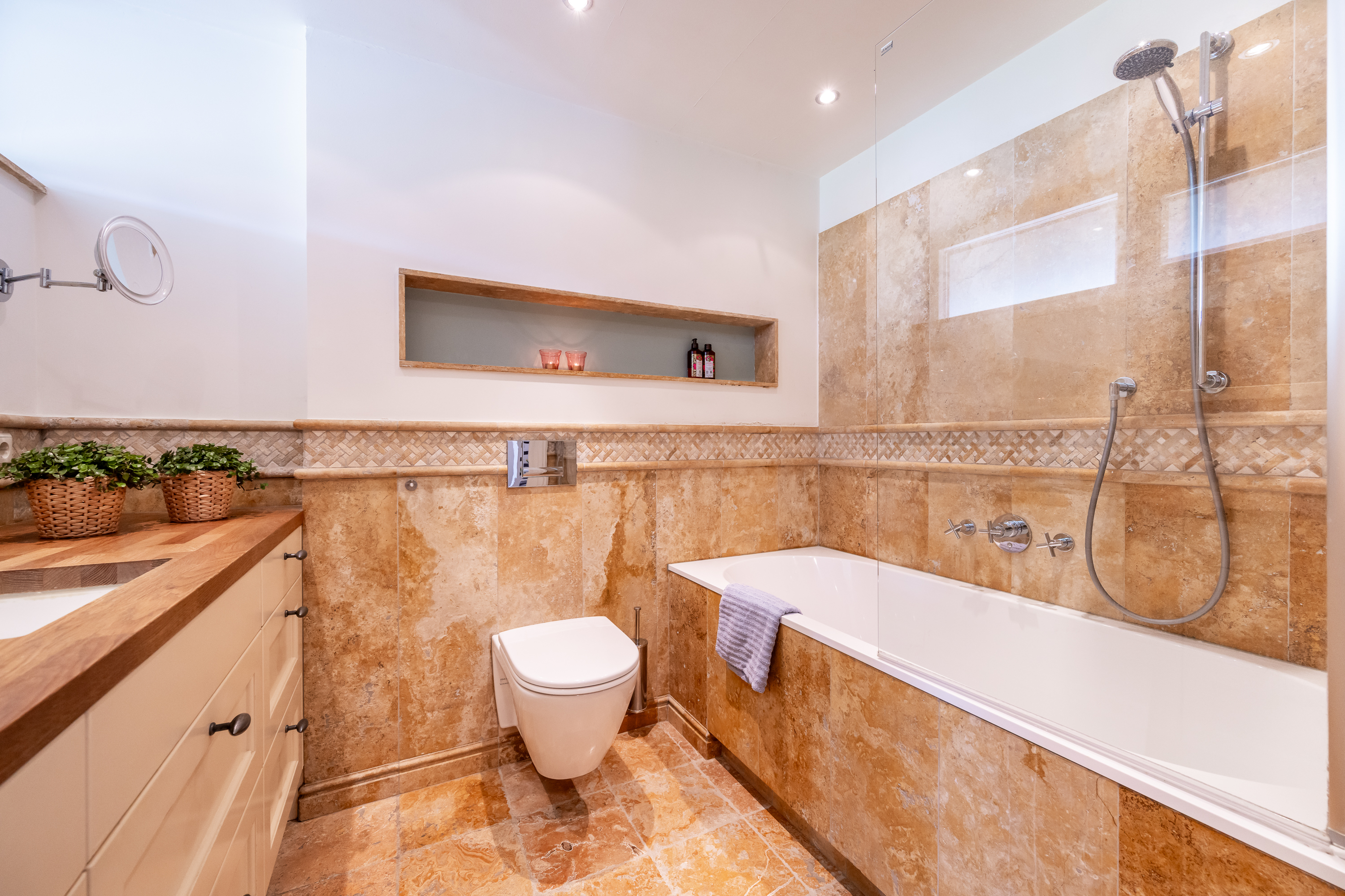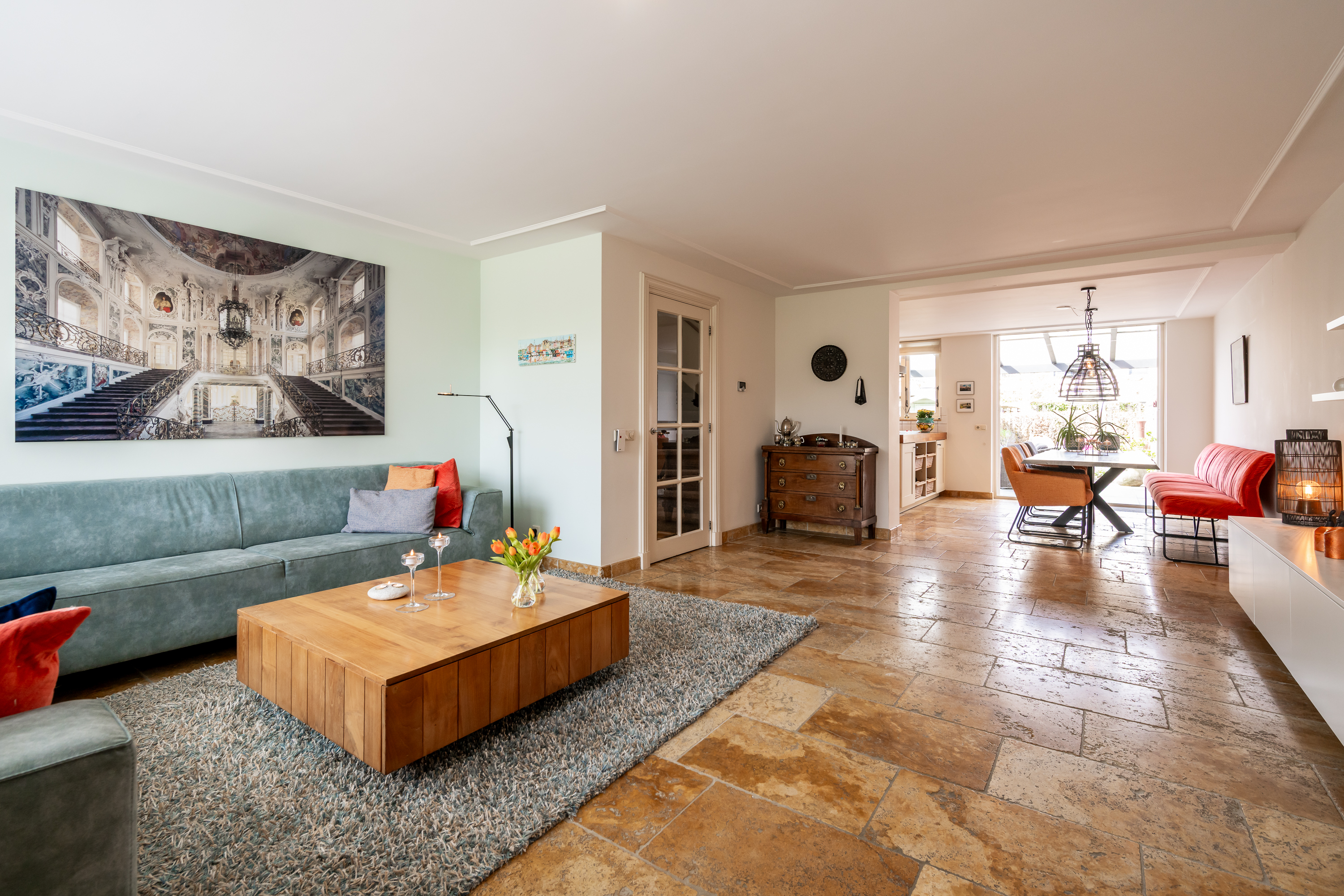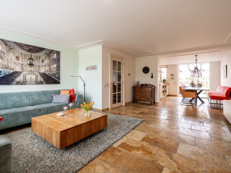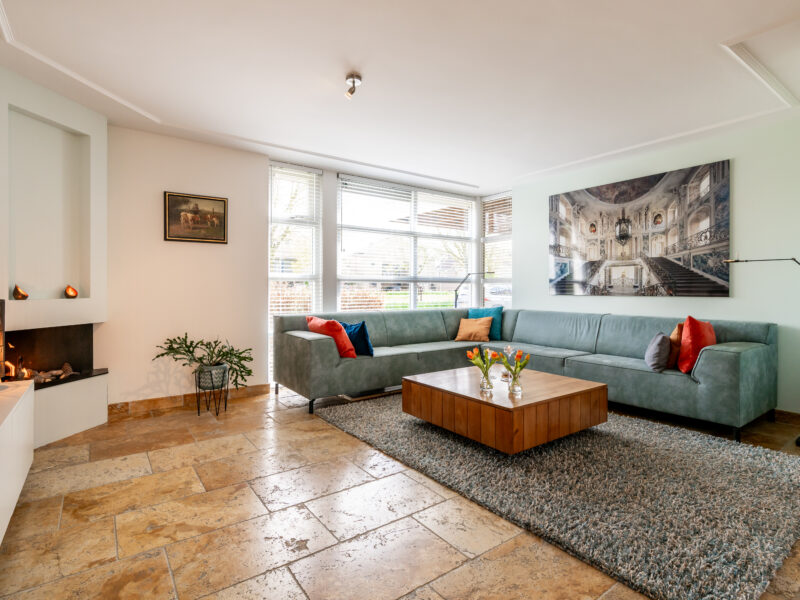 De TRAVERTINE vloer in combinatie met VLOERVERWARMING zorgt voor een aangenaam wooncomfort. Het strakke stucwerk en de plafonds met sierlijsten geven het geheel een verzorgde en rustige uitstraling.