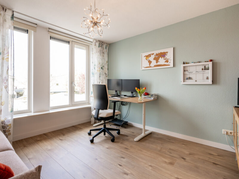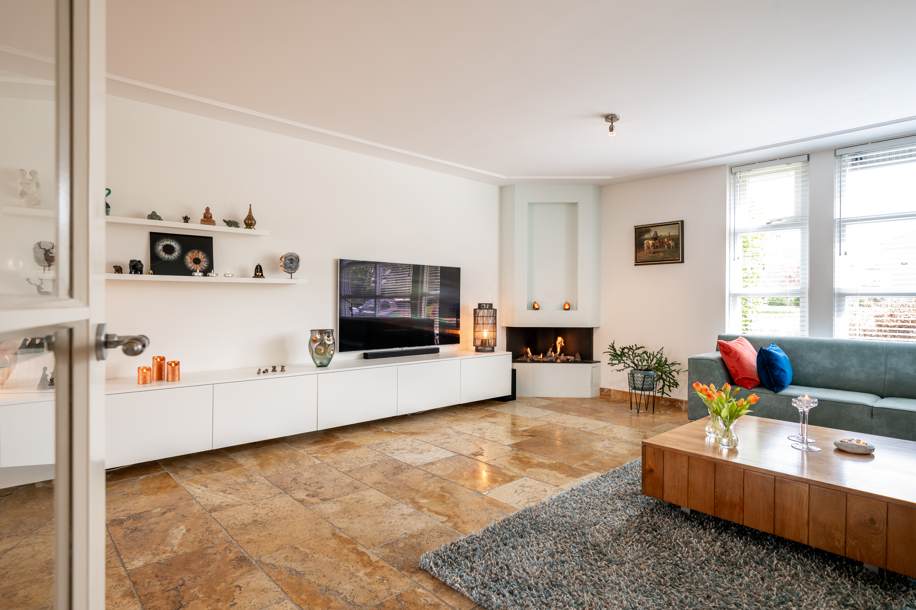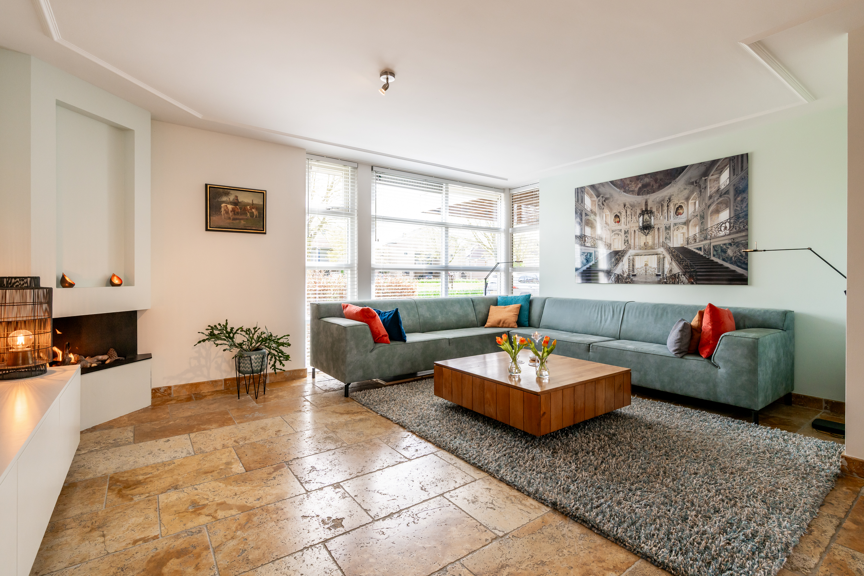 Aan de voorzijde ligt de living. Deze ruimte voelt royaal aan en biedt volop mogelijkheden voor een comfortabele zithoek. De grote raampartijen zorgen voor een prettige lichtinval, terwijl de open GASHAARD een warme en sfeervolle plek creëert.