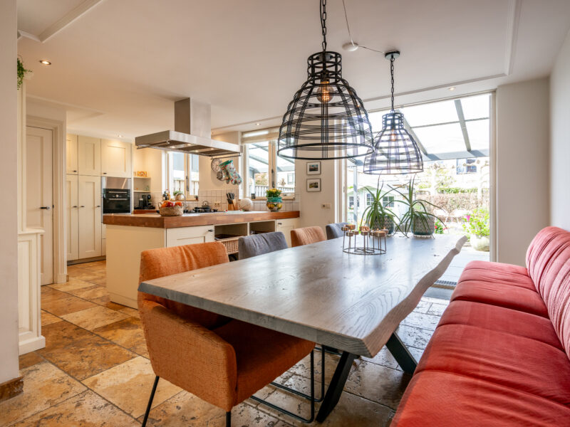 Aan de achterzijde sluit het eetgedeelte naadloos aan op de OPEN keuken met schiereiland. Hier komen koken, tafelen en samenzijn op een natuurlijke en prettige manier samen.