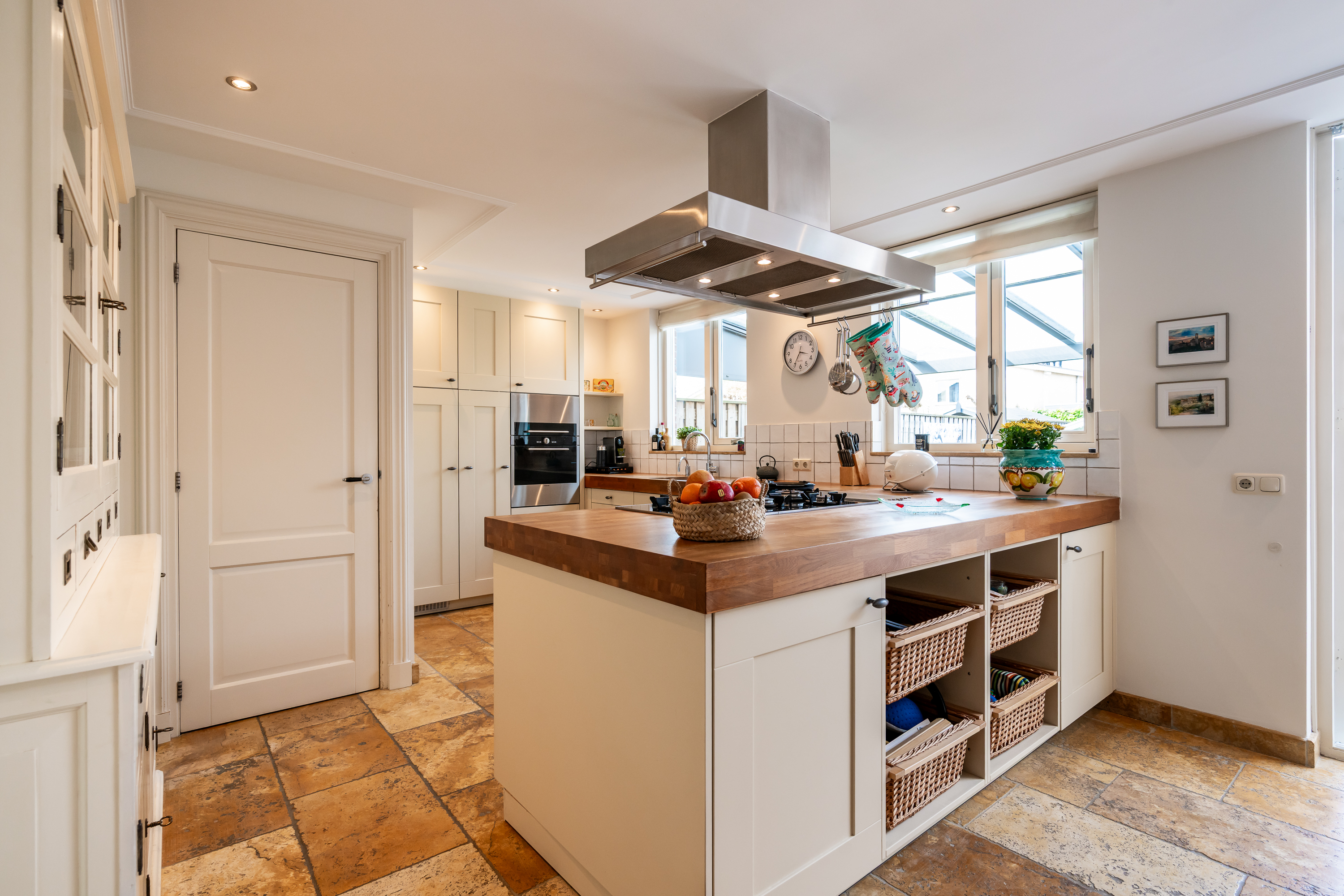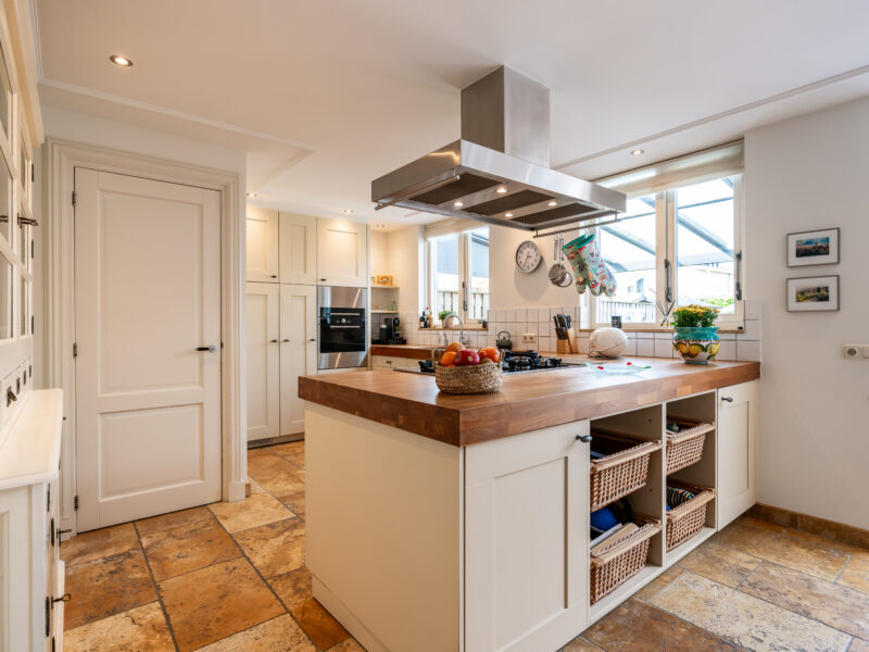 De keuken is uitgevoerd in een LANDELIJKE stijl en vormt een fijne plek in huis. Het schiereiland zorgt voor extra werk- en opbergruimte en houdt tegelijkertijd contact met de eethoek.
