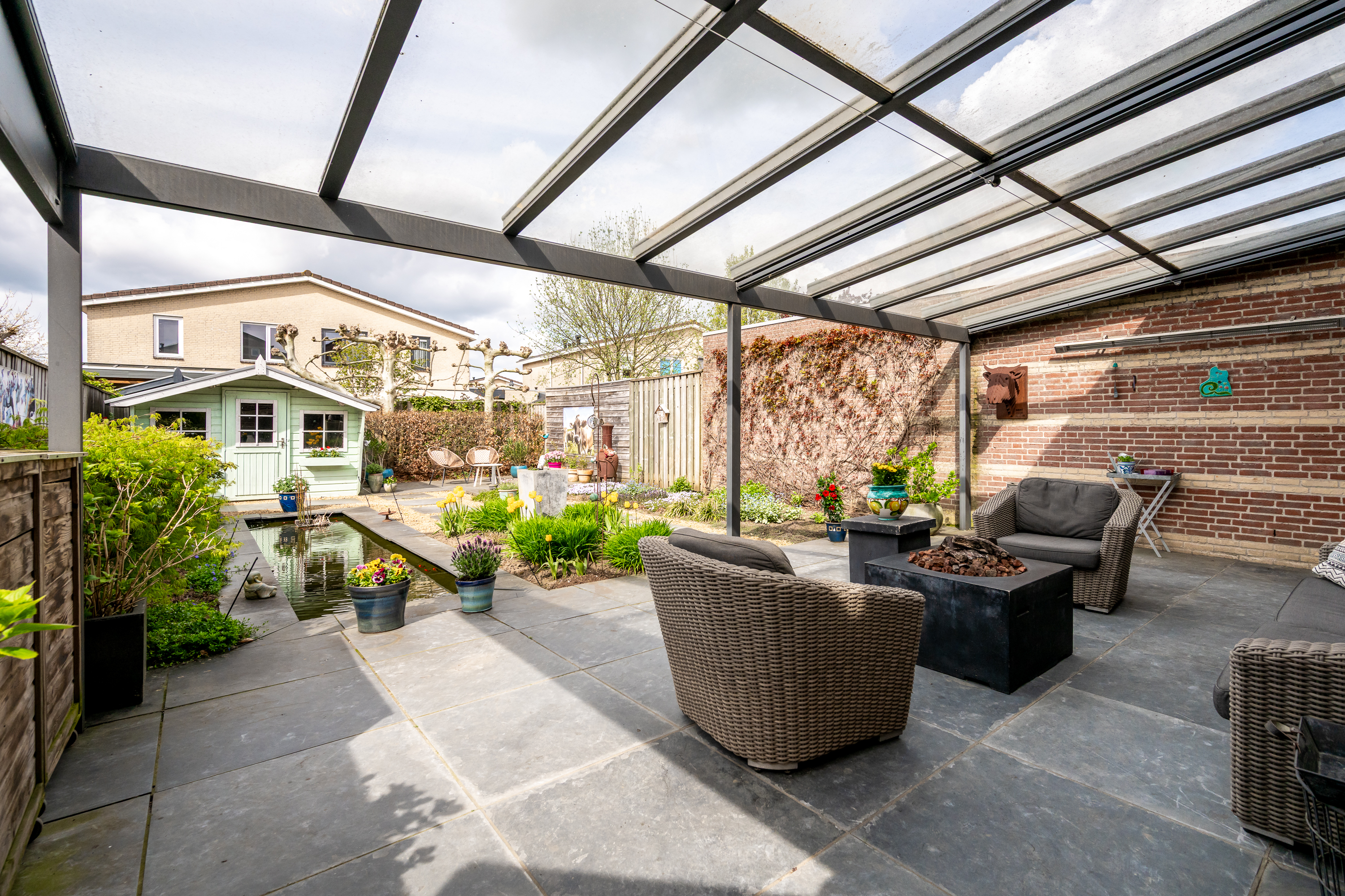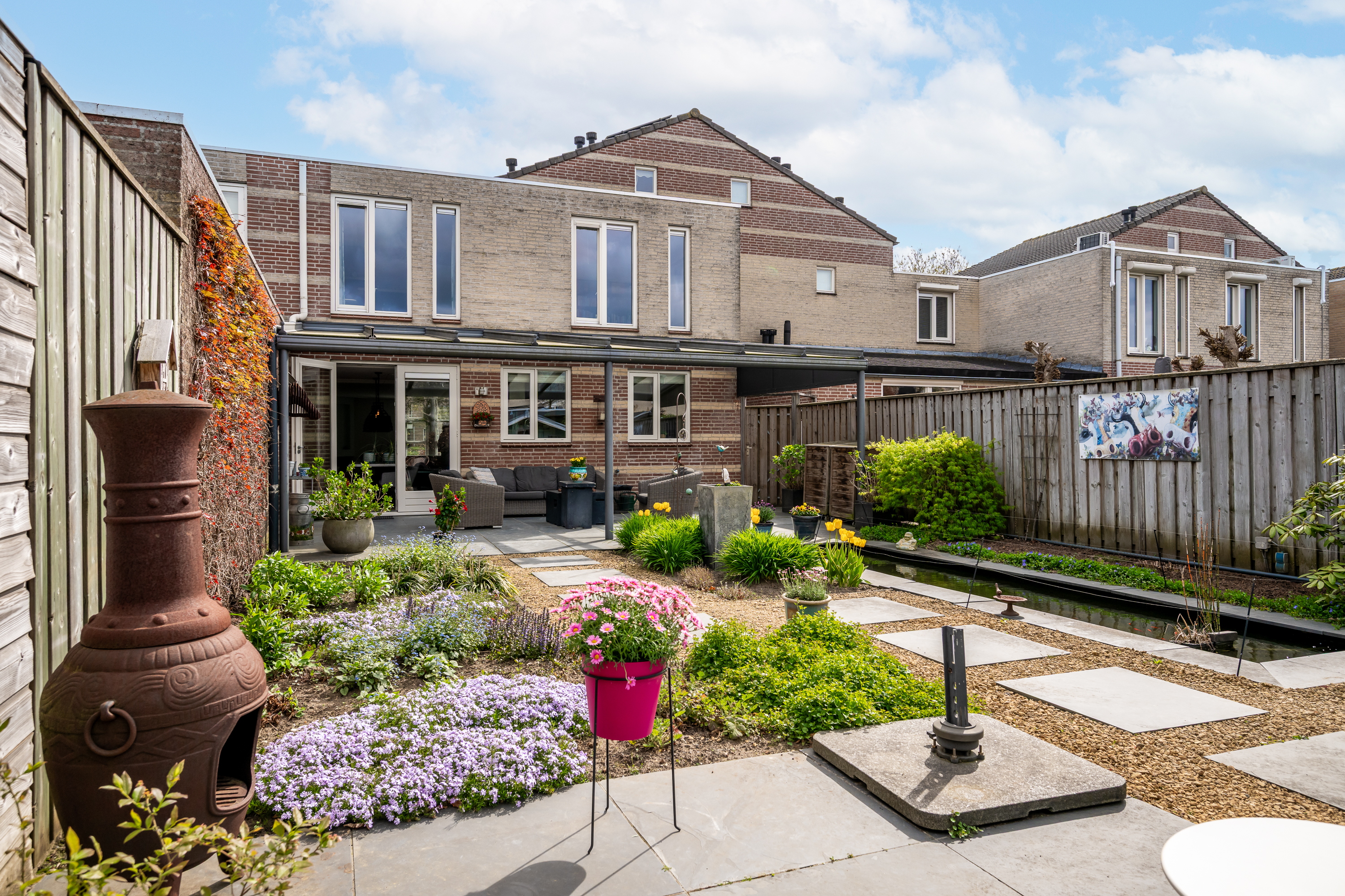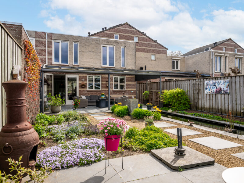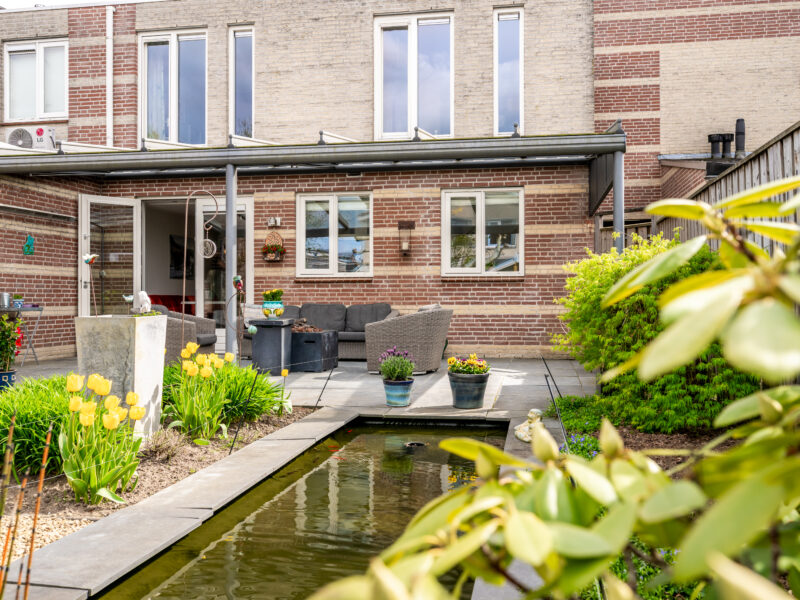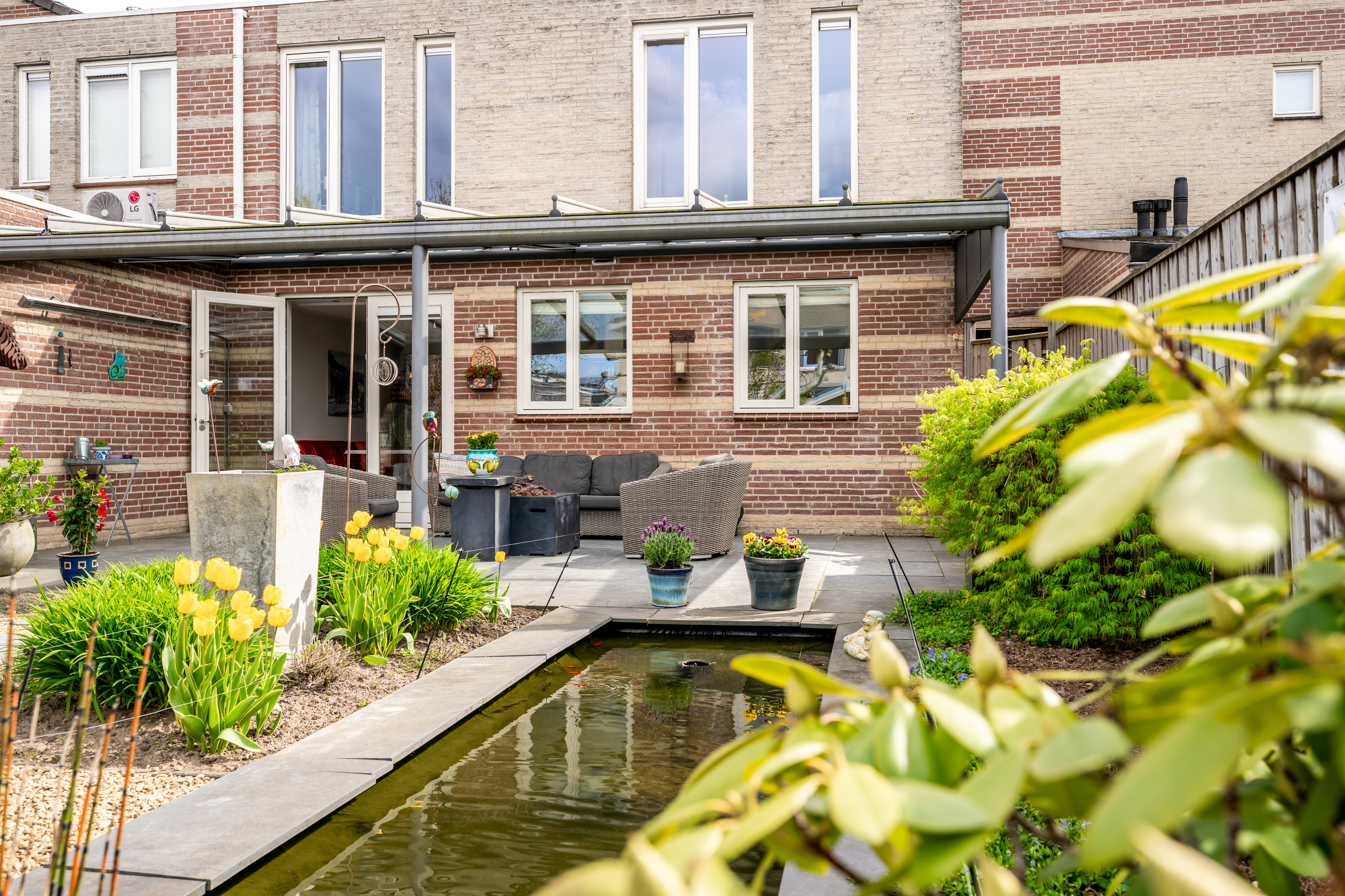 De tuin is ingericht met natuursteen, een VIJVER en diverse groene beplanting. Het terras achterin en de verschillende zones zorgen voor meerdere prettige zitplekken, waardoor u op ieder moment van de dag een passende plek vindt om van het buitenleven te genieten.