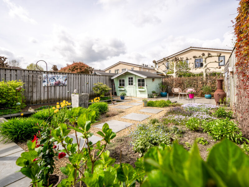 • Fraai aangelegde tuin met vijver, OVERKAPPING en tuinberging