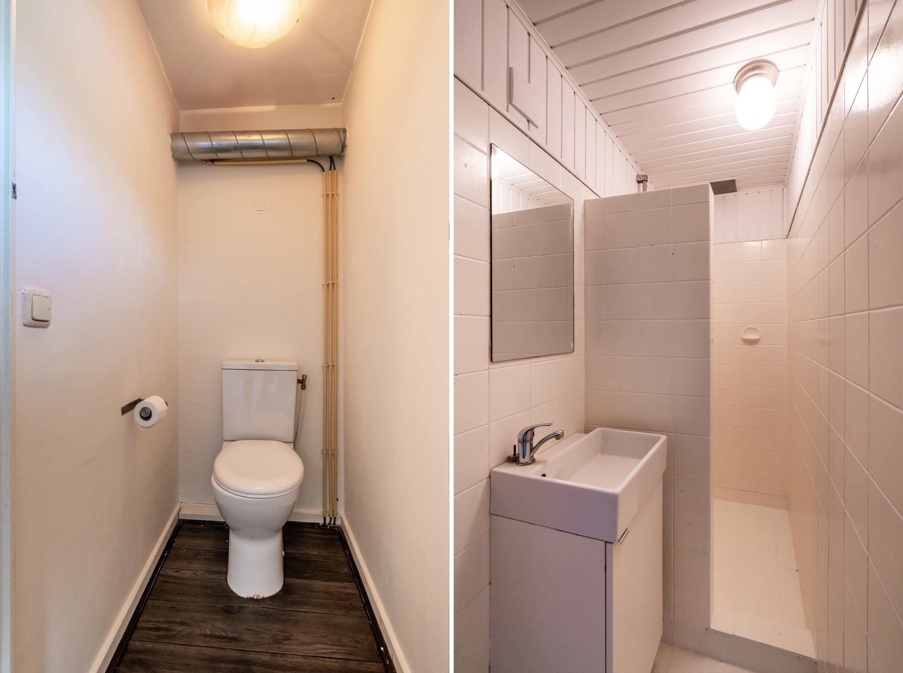 De badkamer is praktisch ingericht met een douchecabine, een toilet en een wastafel.