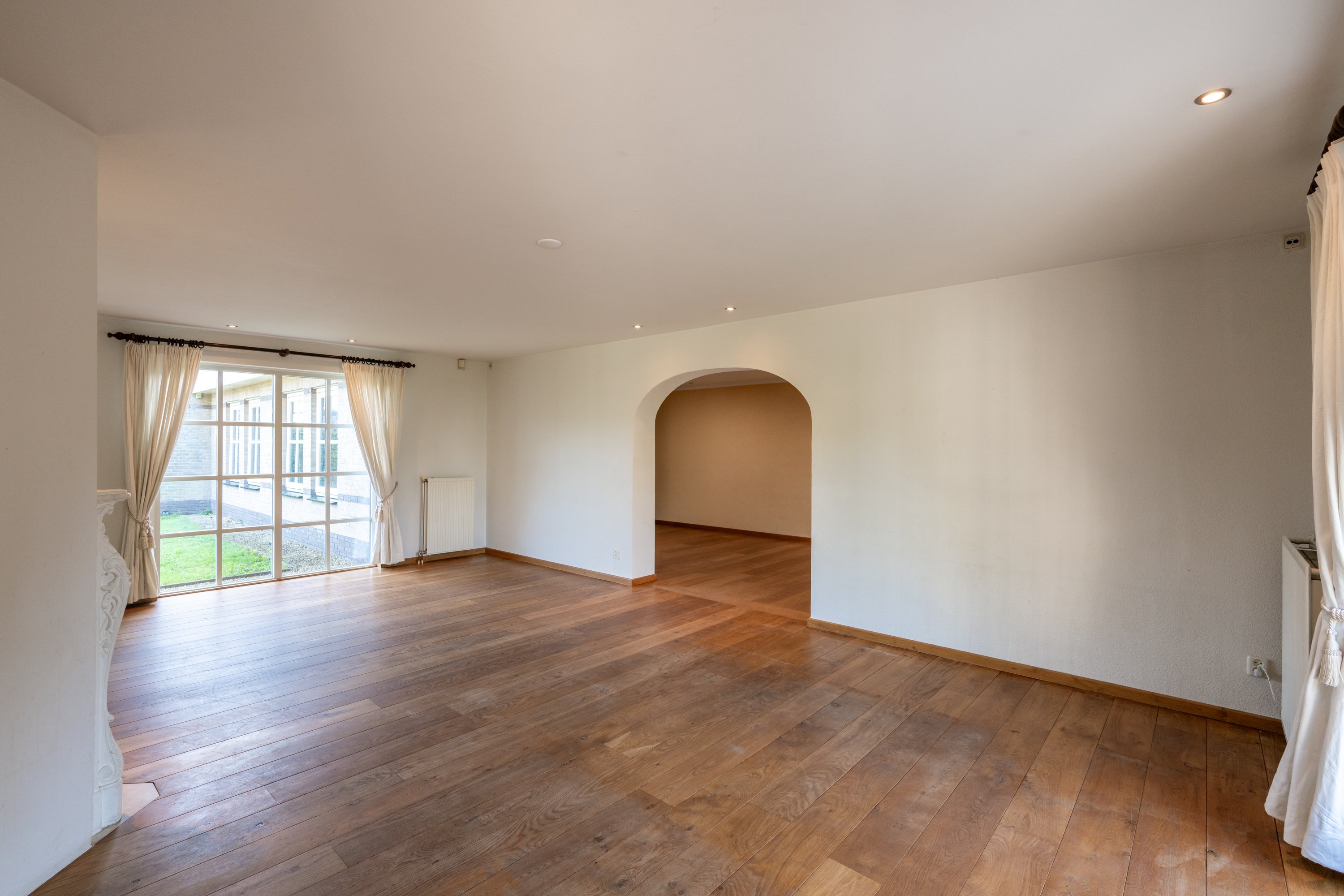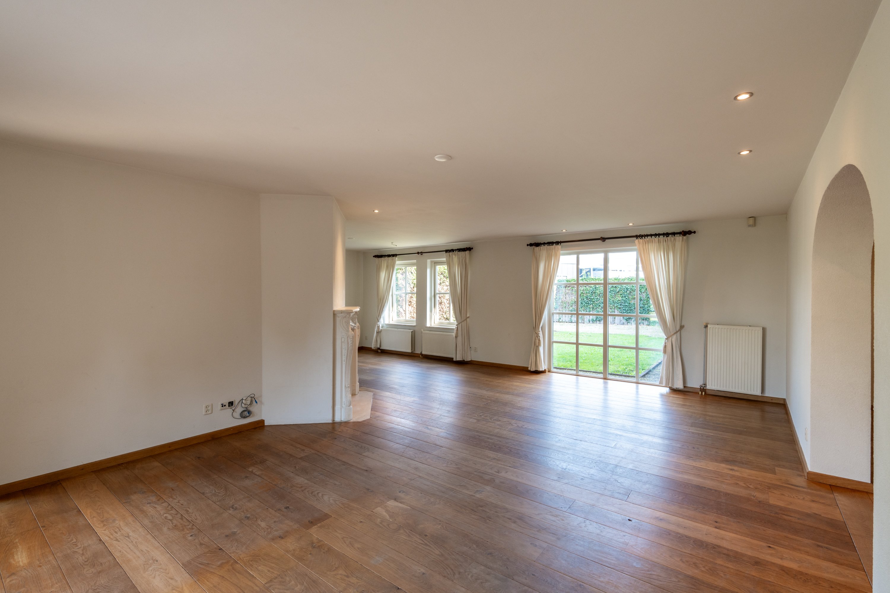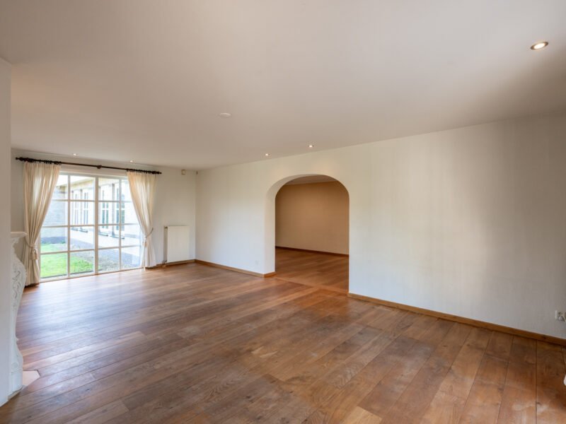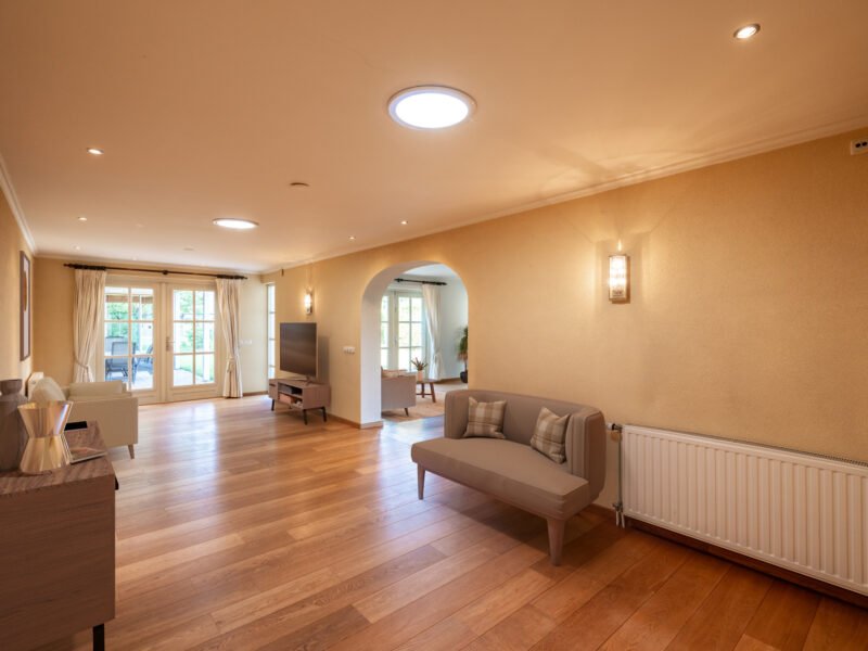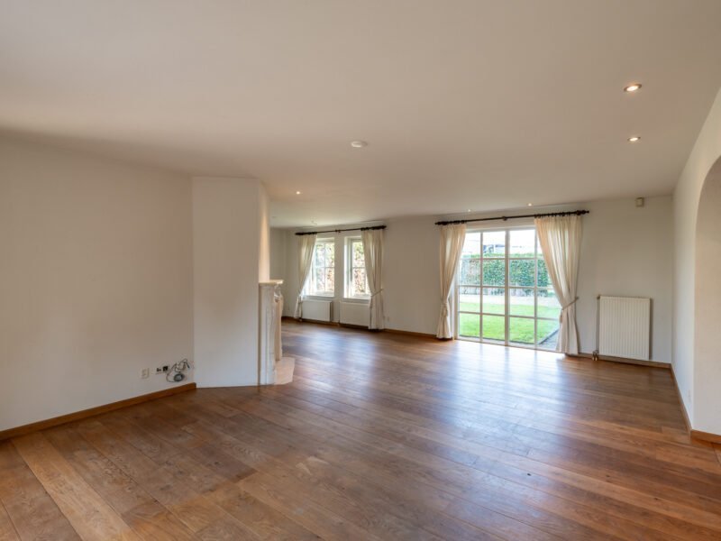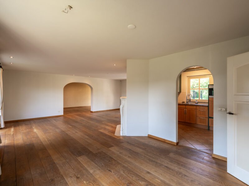 De living is afgewerkt met een Frans EIKEN vloer, lichte spachtelputz wanden en stucwerk plafonds.