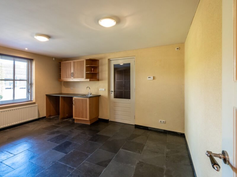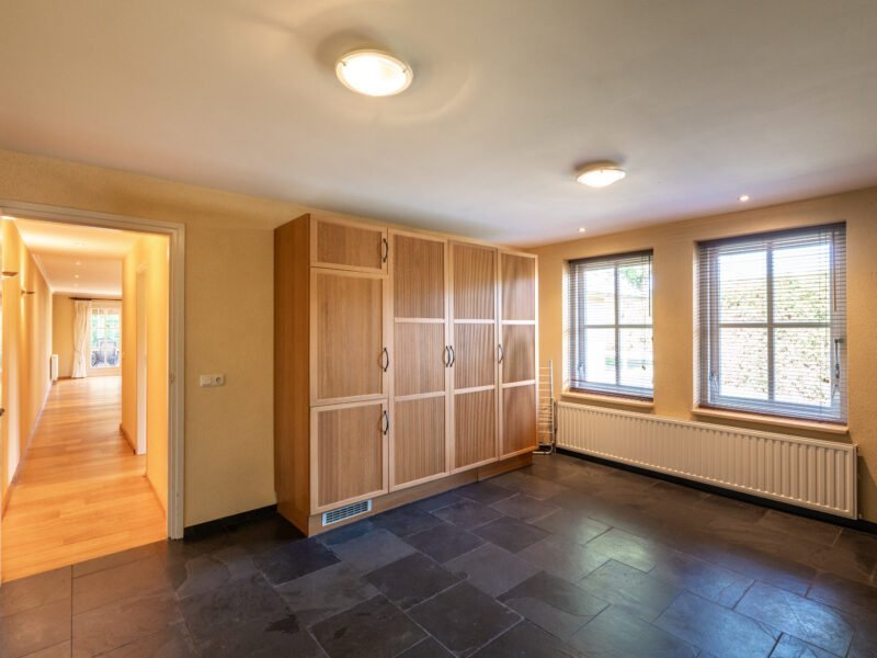 Direct aansluitend aan de keuken betreedt u de BIJKEUKEN. Hier is voldoende ruimte voor bijvoorbeeld een koel-vriescombinatie, of extra opbergmogelijkheden. Van hieruit is de tuin te betreden.