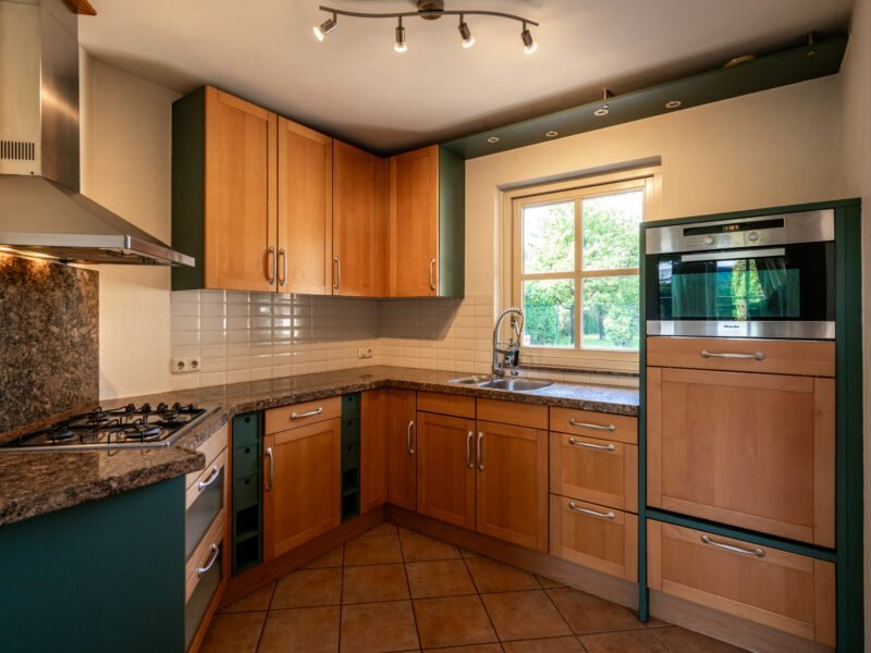 Zowel de keuken als de bijkeuken zijn afgewerkt met een lichte TEGELvloer.