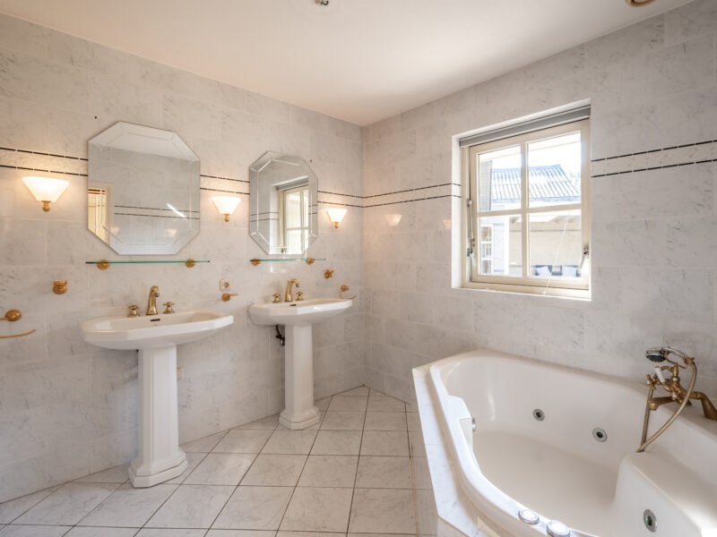 De badkamer treft u ENSUITE aan de master bedroom. De ruimte is geheel betegeld in een lichte kleurstelling en voorzien van een dubbele wastafel en een WHIRLPOOL bad. Een raam zorgt voor natuurlijke lichtinval.